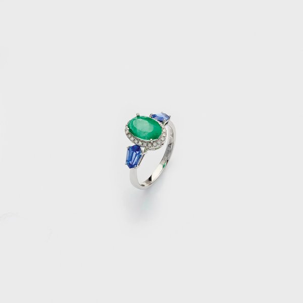 Ring set with cornflower blue sapphires approx. 1,20 ct., an emerald approx. 1,80 ct. and diamonds approx. 0,13 ct., in 18 k white gold.