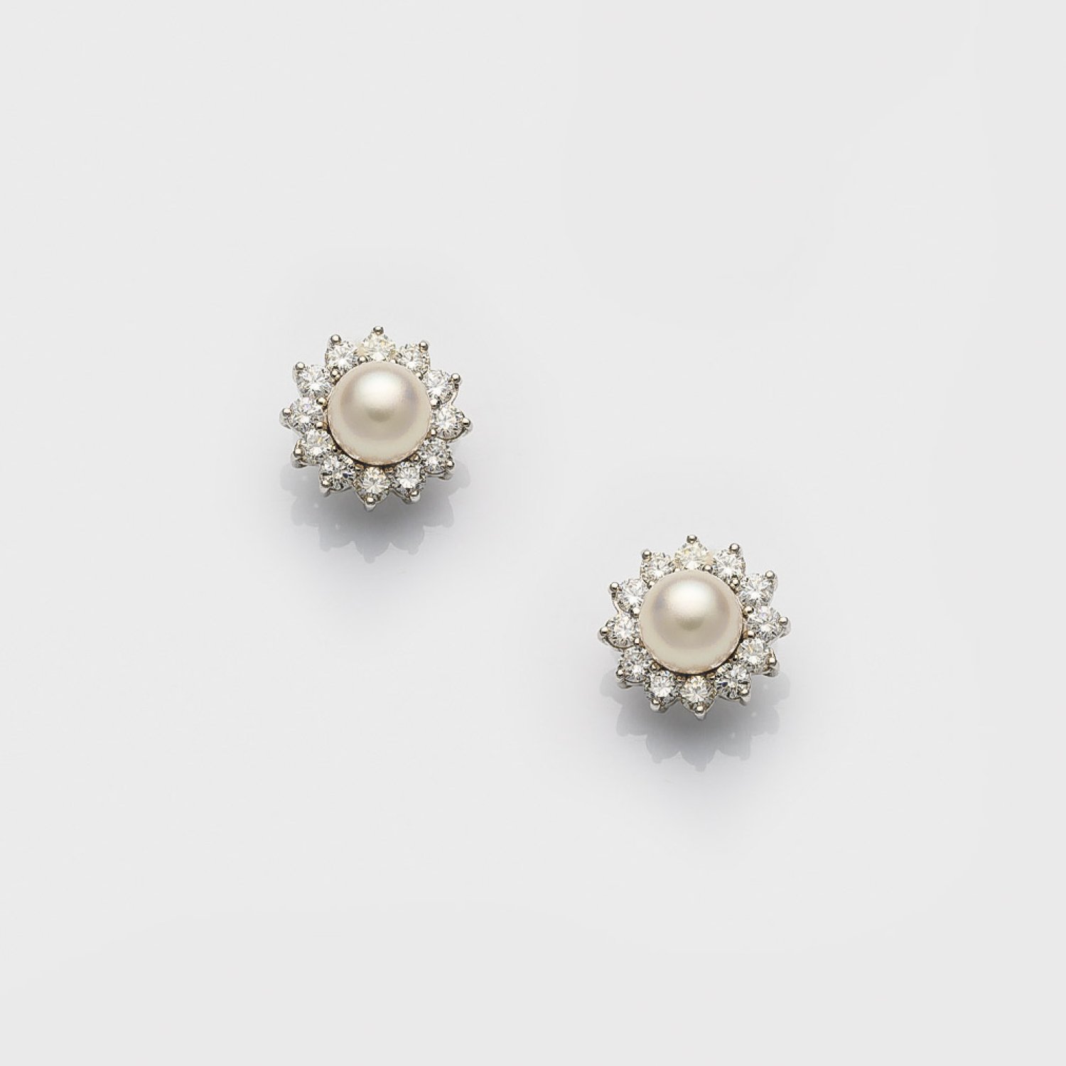 Pair of earrings set with 2 culture pearls approx. 8,7 mm and brilliants approx. 1,50 ct. (G-H/si), in 18 k white gold.