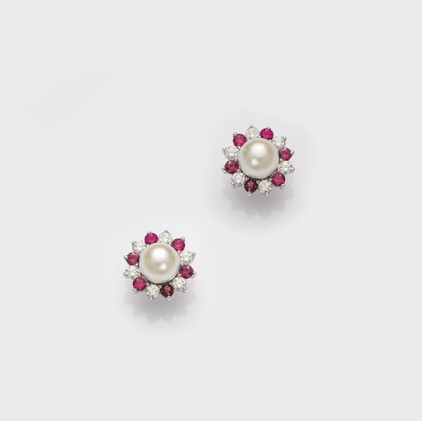 Weißgold, gest. 750. Zentral besetzt mit 2 weißen Zuchtperlen von ca. 7,6 mm in sehr feinem, rosé-grün changierendem Lüster, entouriert von Brillanten von zus. ca. 0,75 ct. (G-H/si) und Rubinen von ca. 0,75 ct.; Ges.-Gew. ca. 7,17 g.