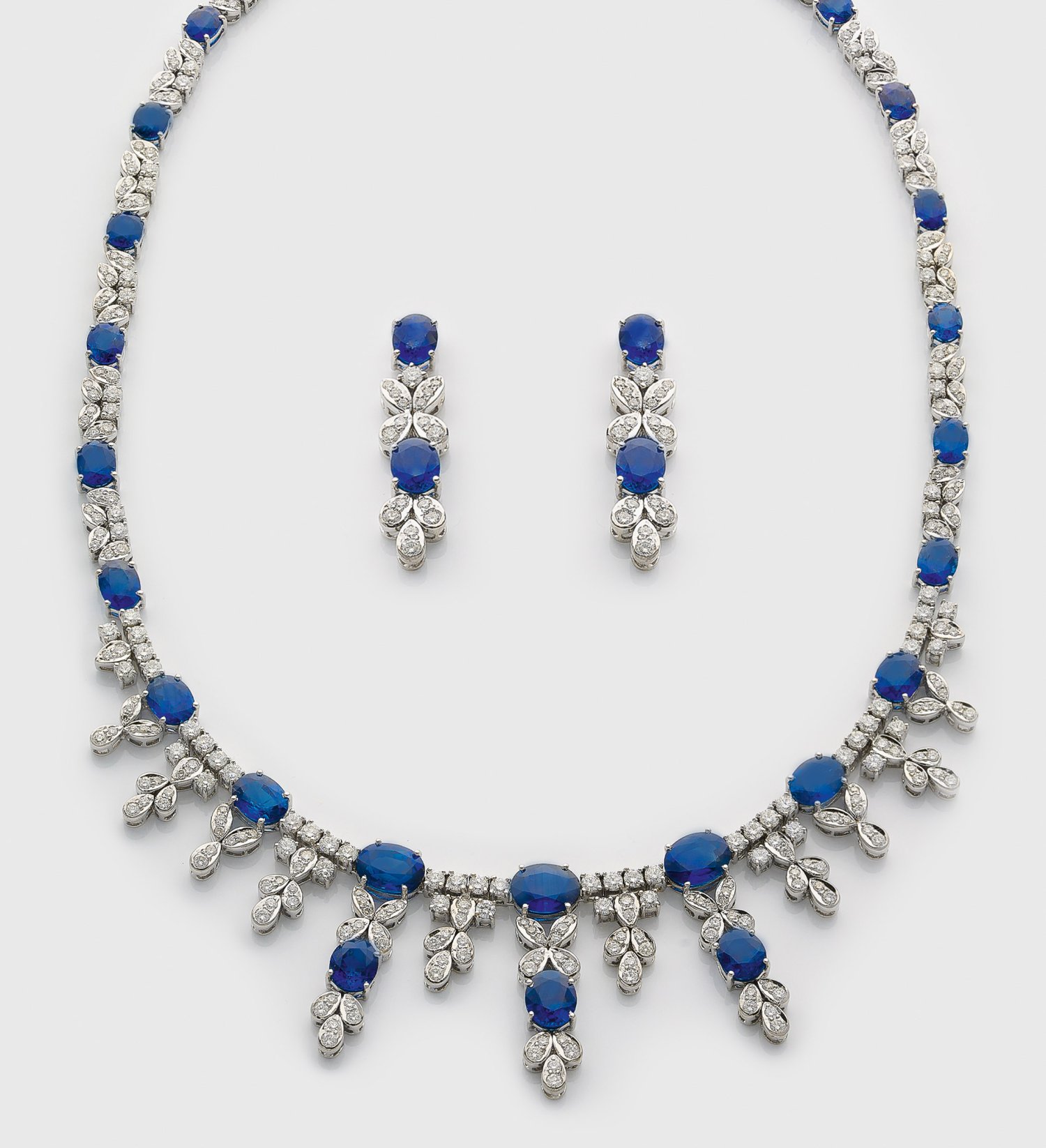 Collier und korrespondierendes Paar Ohrgehänge. Weißgold, gest. 750. Schauseitig besetzt mit kornblumenblauen Saphiren von zus. ca. 38,66 ct. und Brillanten von zus. ca. 9,50 ct.; Ges.-Gew. ca. 69,04 g.