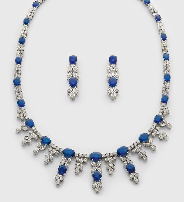 Necklace and a pair of earrings set with cornflower blue sapphires approx. 38,66 ct. and diamonds approx. 9,50 ct., in 18 k white gold.