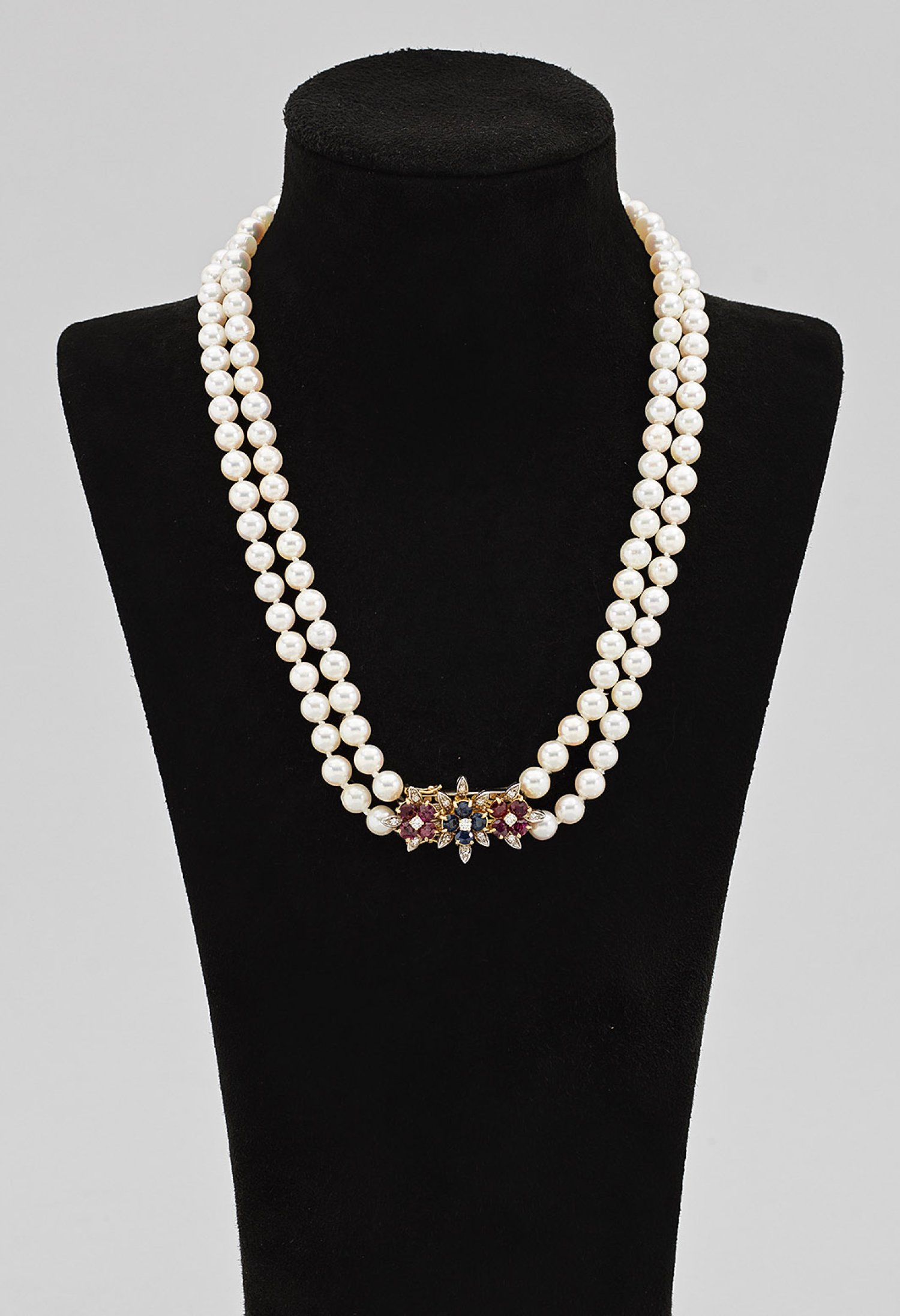 Weiß- und Gelbgold, gest. 750. Zweireihige Kette aus weißen Akoyaperlen von ca. 6,5 mm in sehr farbintensivem, rosé-grün changierendem Lüster. Schließe besetzt mit Rubinen und Saphiren von zus. ca. 1,80 ct. sowie Brillanten von zus. ca. 0,29 ct. (vvsi/w). Gew. ca. 51,02 g.
