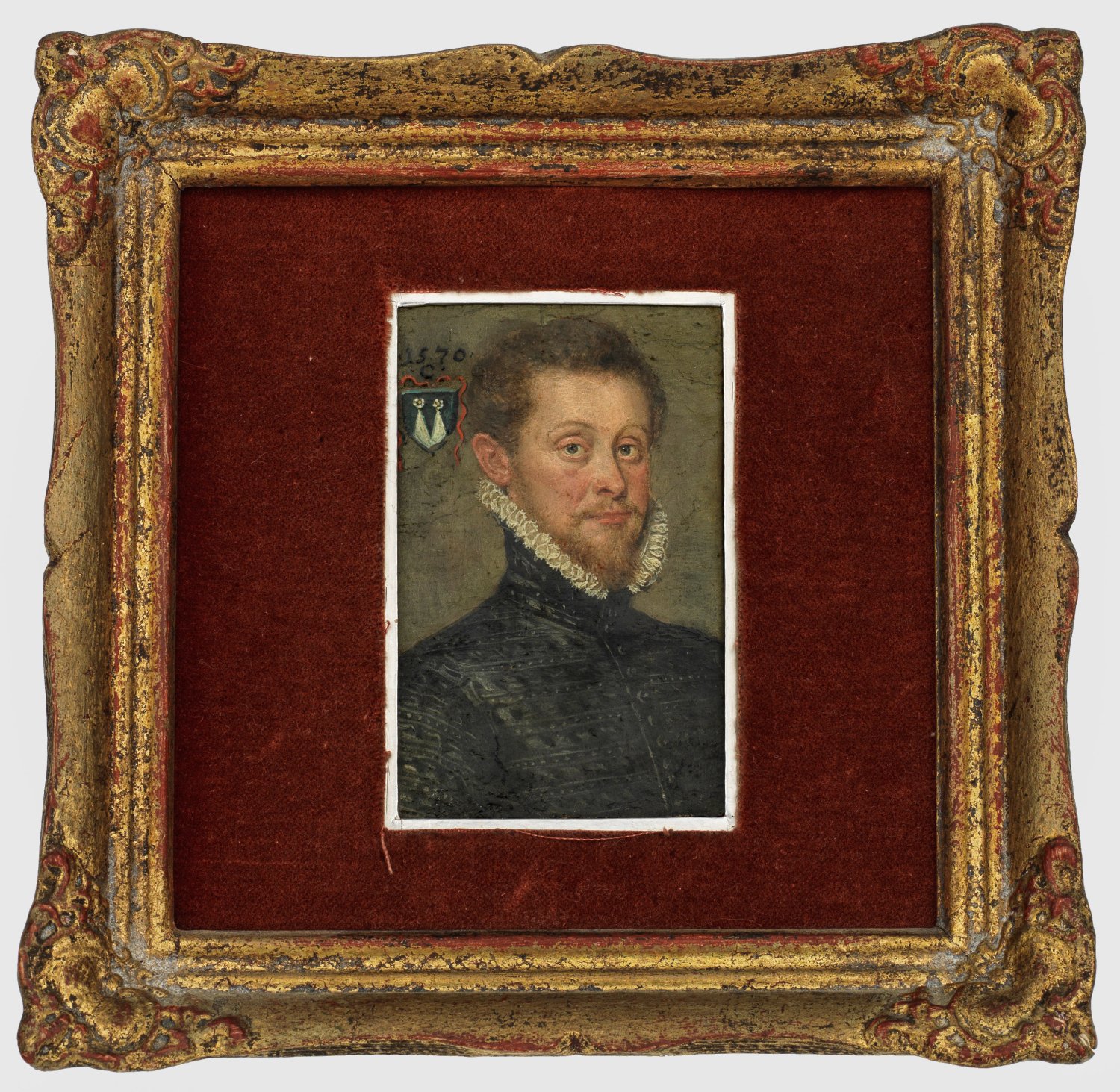 Repräsentatives, äußerst fein gemaltes Brustbildnis des jungen Mannes mit rötlichem, gelocktem Haar und leicht nach links gedrehtem Oberkörper und Gesicht. Bekleidet mit aufwendig bestickter, schwarzer Jacke und hohem Kragen mit weißer, feiner Spitze. L. o. dat. "1570 C" über Darstellung des Stammwappens der Adelsfamilie, deren Stammsitz sich nordöstlich von Augsburg in Schernegg im Landkreis Aichach-Friedberg befindet. 6,2 cm x 9,3 cm. Öl/Kupfertafel. Rahmen.