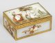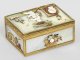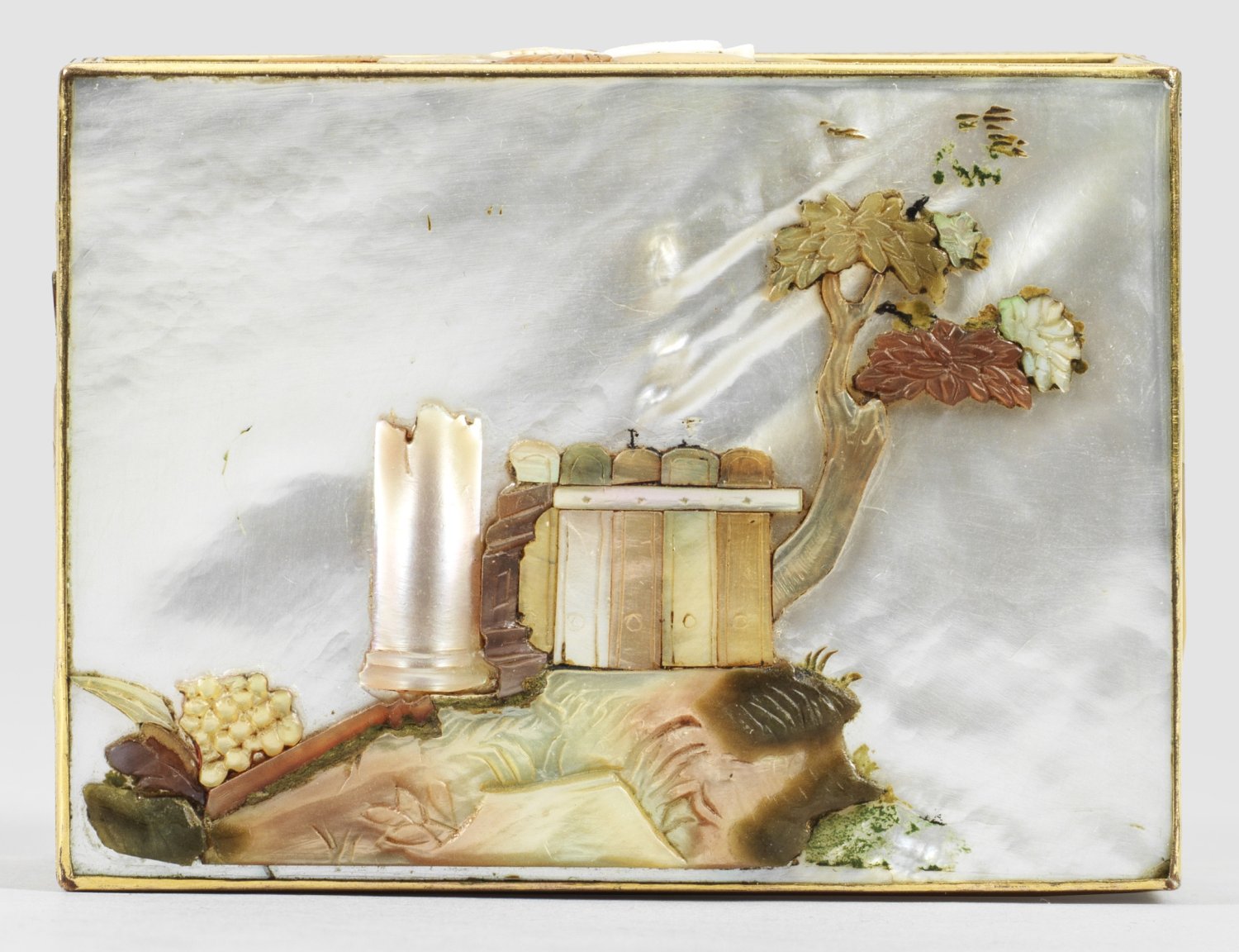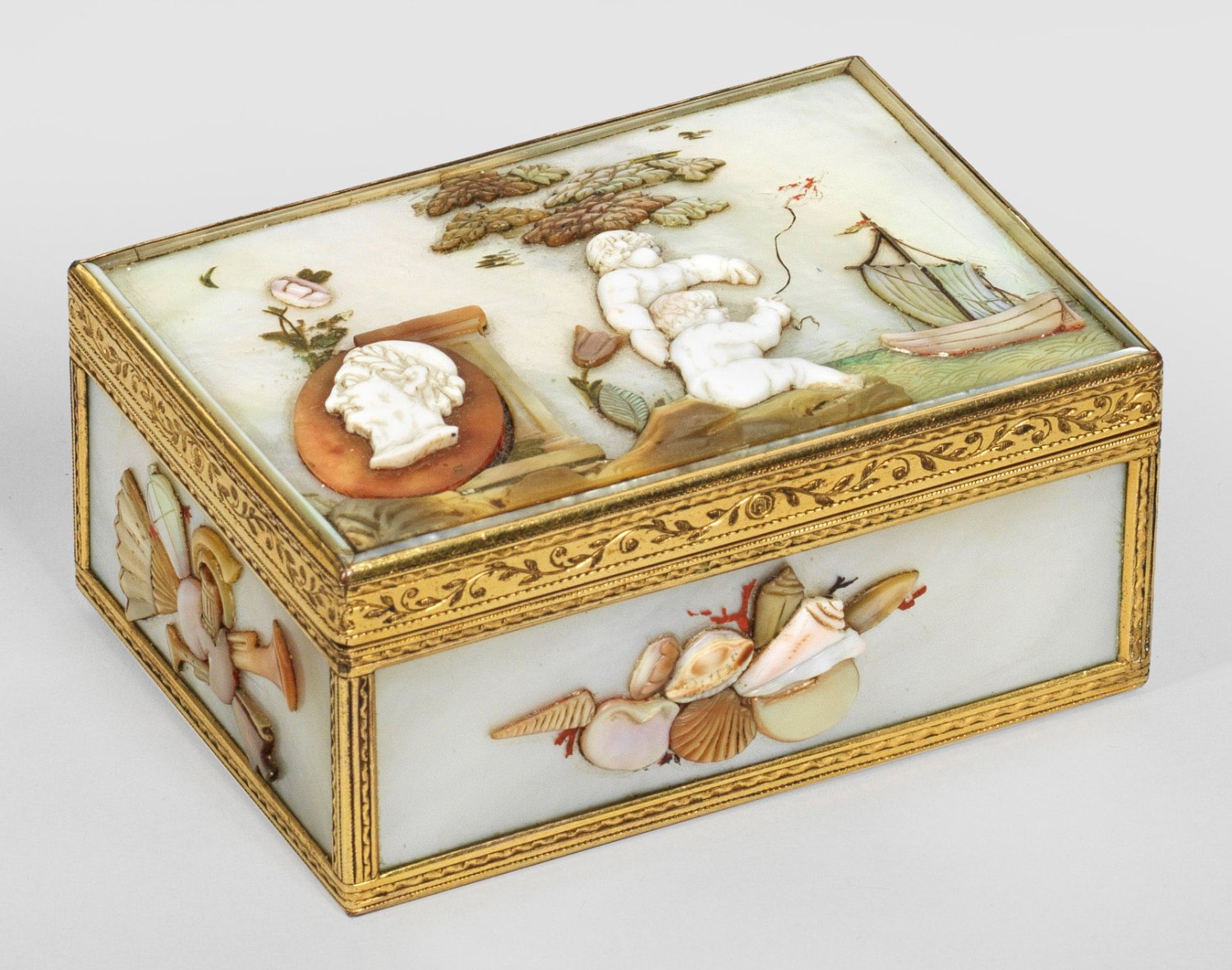 Perlmutter mit vergoldeter Messingmontierung. Rechteckiger Korpus aus sechs reliefplastisch gestalteten Perlmuttereinlagen mit schmaler, teilw. profilierter von ziselierten Blattranken und Wellenbändern umzogenen Randmontierung "à cage". Auf gerader Wandung umlaufend antikisierte Darstellungen aus geschnittenen, unterschiedlich farbigen und applizierten Perlmutter- und Edelsteinelementen wohl in Anlehnung an die vier Elemente Wasser, Luft, Erde und Feuer. Auf flachem Scharnierdeckel die Ansicht einer baumbestandenen Uferlandschaft, mittig mit zwei Putti, einen Drachen steigen lassend. Links davon eine ovale, an eine Säule gelehnte, medaillonförmige Reliefplatte mit Cäsar-Büste. Rechts ein See mit Fischerboot. Auf der Unterseite die Reste einer architekturbestandenen Berglandschaft. Die Seiten mit Trophäenbündeln aus Musikinstrumenten, Muscheln, Schnecken und Korallen sowie einem Fruchtkorb und zwei Kanonen mit Pulverfass dekoriert. Im Deckelinneren altes Etikett ''Sammlung R.S.P. 760''. Mit Fehlstellen. H. 3,5 cm. 7,8 cm x 5,5 cm.