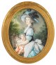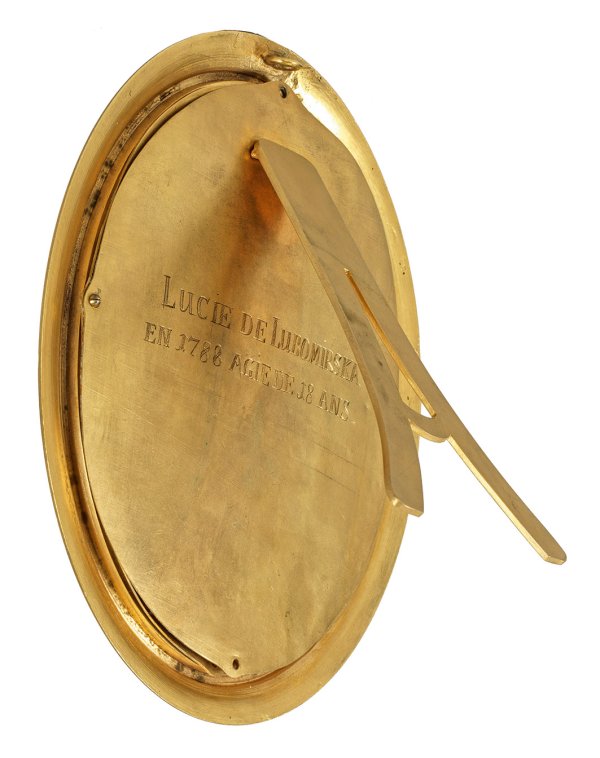 Mit Lederetui. Ovale Porträtdarstellung der Fürstin nach links mit Blick in Richtung des Betrachters, an den Flügelfedern des vor ihr flehend knienden Amors zupfend. Bekleidet mit hellblauem Kleid, akzentuiert von Spitzen und Perlen und dunklem Samt-Mieder. Auf dem Kopf ein kunstvoll gestalteter, blauer Hut mit dunkelgrauen Straußenfedern und Perlen über grauen, lang gewellten Haaren. Im Hintergrund ein Vogelkäfig mit eingesperrtem Putto, umgeben von bewaldeter Landschaft. Auf dem Käfig sign. und dat. "1788". Feine Temperamalerei auf Elfenbein. Dekorativer, vergoldeter Original-Messingrahmen mit Perlfries, rückseitig aufstellbar. Rückwand graviert bez. "Lucie de Lubomirska en 1788, agie de 18 ans". Etui mit weinrotem Samt- und Seidenfutter ausgekleidet. 16,5 cm x 13 cm.