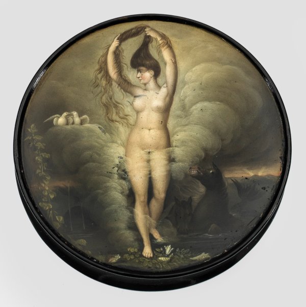 Pappmaché, schwarz lackiert. Rund mit gekehlter Wandung. Auf dem Deckel die Darstellung einer unbekleideten Schönheit aus dem Meer steigend mit langen, dunkelblonden Haaren und lediglich leicht von Wolken und Nebelschwaden umhüllt. Zu ihrer linken Seite im Wasser zwei Hippokampen, zu ihrer rechten ein Delphin sowie auf einer Wolke ein Paar weiße Turteltauben. Im Innendeckel in Rot betitelt "Geburt der Venus" und nummeriert "6274". Innenboden korrespondierend nummeriert und bez. "Stobwassers Fabrik in Braunschweig". Polychrome Lackmalerei. H. 1,5 cm. D. 9,5 cm.