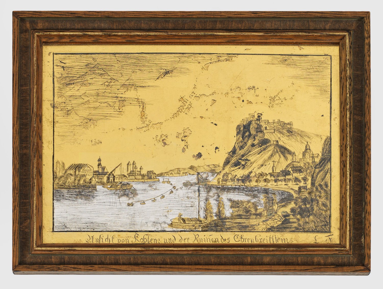 Historische Ortsansicht vom Rhein aus mit Segelbooten. Links mit Blick auf Koblenz und die sog. Fliegende Brücke. Rechts die Festung Ehrenbreitstein nach der Sprengung durch die Franzosen 1801. Nach einer Radierung von Christian August Günther (1760 - 1824). Unterhalb bez. und sign. Gold- und Silberfolie/Glas. Besch.; 22,5 cm x 15,5 cm. Mit Rahmen.