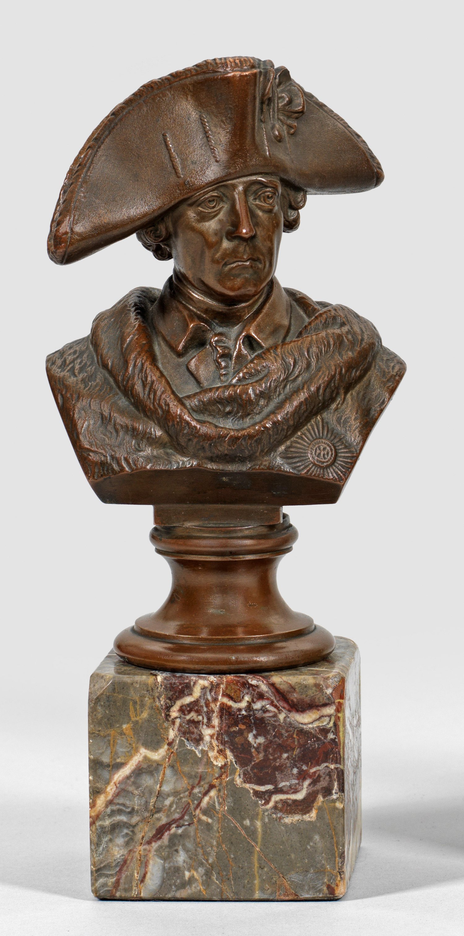 Bronze, braun patiniert.; Marmorsockel. Um 1900 ausgeführte Büste als Teilreplik nach dem 1851 vollendeten Reiterstandbild Unter den Linden in Berlin. Ges.-H. 25,5 cm.