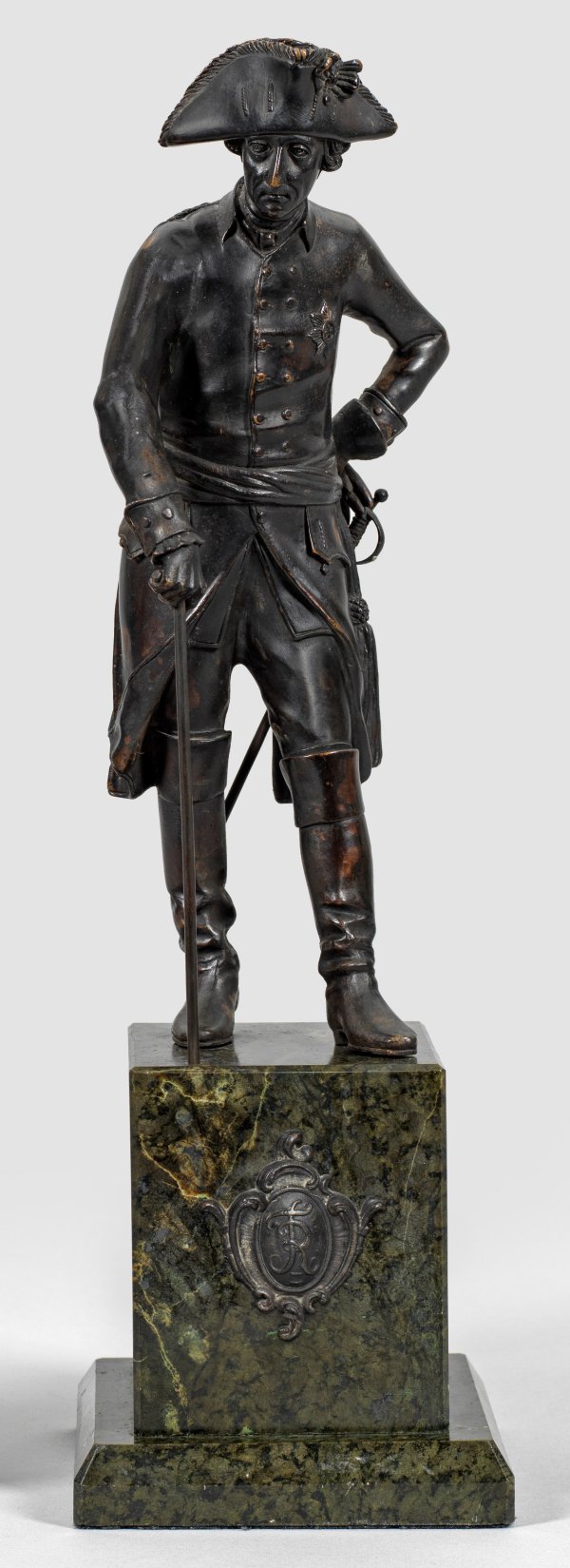 Bronze, dunkel patiniert; Serpentinsockel. Künst-Bez. "Rauch CH", Gießerstempel "EK". Um 1900 entstandene Statuette des "Alten Fritz" in Uniform und Dreispitz, die rechte Hand auf einen Stock gestützt. Schauseitig aufgelegte Rocaillenplakette mit ligiertem Monogramm "FR II". Ges-H. 36 cm.