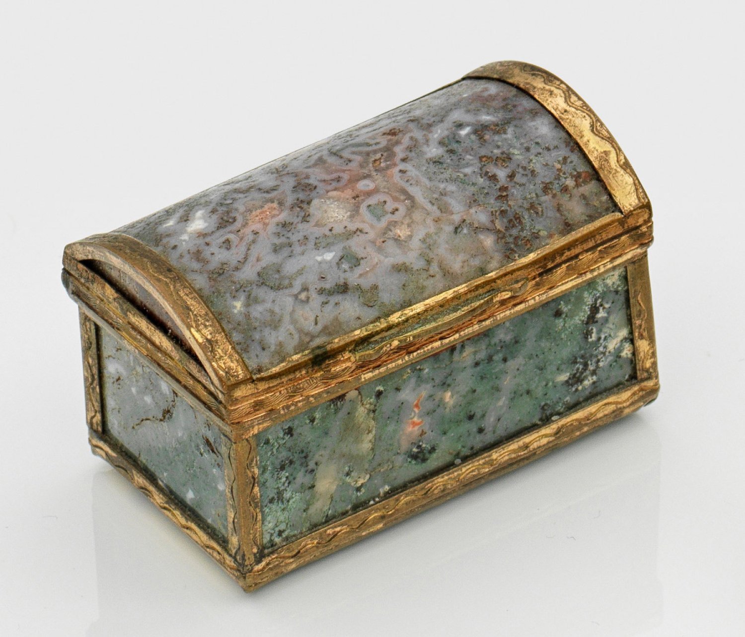 Achat und Messing. Rechteckige Form mit scharniertem, gerundetem Deckel. Schmale, teilw. profilierte von ziselierten Wellenbändern umzogene Randmontierung. Die Wandung aus geschliffenem, flieder-, grün- und graufarbenem Achat. H. 3,3 cm. 5,2 cm x 3 cm.
