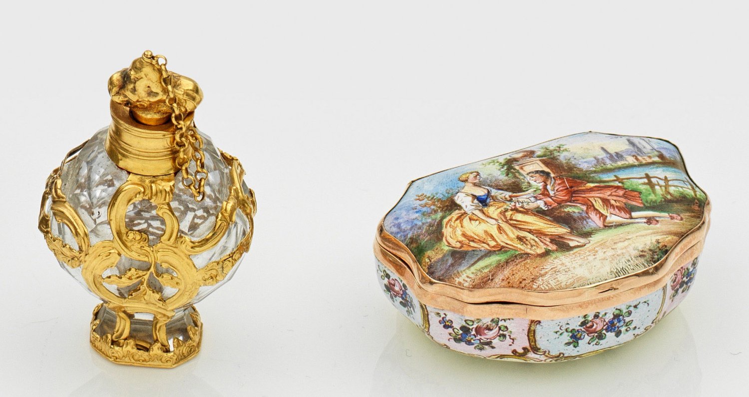 mit Gold- bzw. Rotgoldmontierung. Tabatiere mit galantem Liebespaar, Blumenbuketts und -körben in polychromer Emaillemalerei verziert. Der Flakon aus farblosem Kristallglas mit durchbrochen gearbeiteter Rocaillen- und Eichenlaubmontierung. Minim. best.; Teilw. gest., österreichischer Garantiestempel ab 1925 und Buchstabe "W" für Wien, undeutl. Meisterzeichen. H. 2 cm - 5,2 cm.