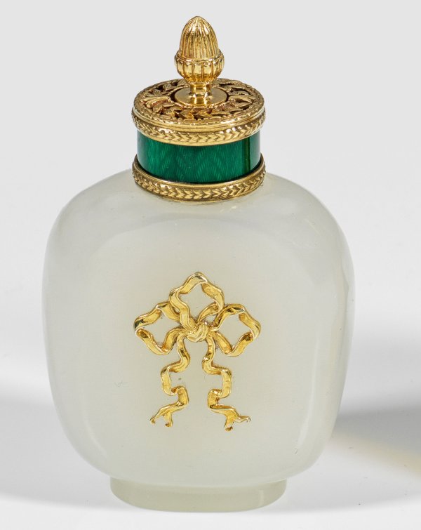 im Stil von Karl Fabergé. Konischer Korpus aus milchig weißem, geschliffenem Achat besetzt mit durchbrochen gearbeiteten Schleifenapplikationen. Zylindrischer Hals, umlaufend dunkelgrün emailliert und gerahmt von ornamentierten Profilringen. Obenauf ein umlaufender Ring aus durchbrochen gearbeitetem Blattkranz. Herausnehmbarer, schmaler Löffel mit vollplastisch gearbeitetem, stilisiertem Knospenknauf. Gest. 88. H. 9,8 cm.