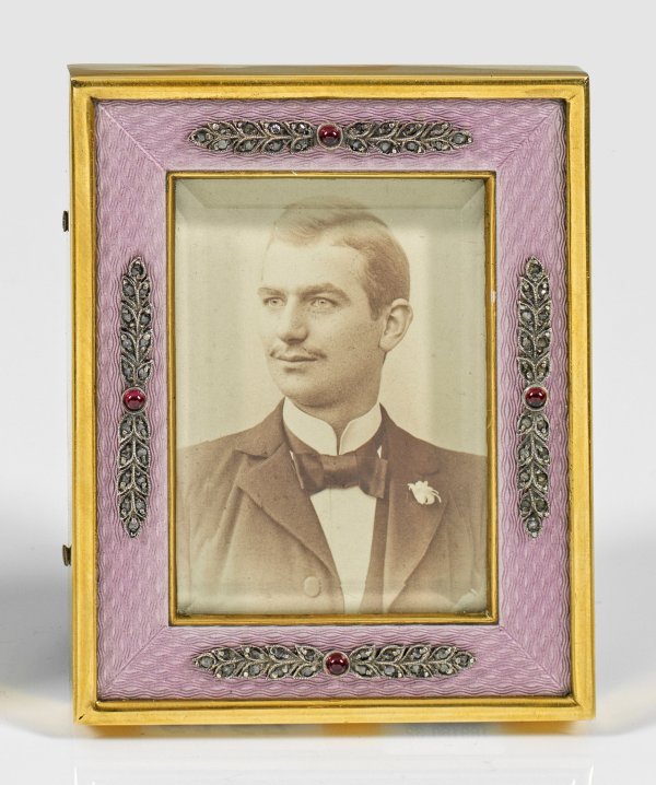 im Stil von Karl Fabergé. Silber, vergoldet und teilw. emailliert. Hochrechteckige Form. Schauseitig flächendeckend hell altrosafarben emailliert über fein wellenförmig guillochiertem Grund. Aufgelegte Blattzweige, besetzt mit Diamantrosen und roten Farbsteincabochons. Rückseitig aufstellbar. Gest. 88. 7 cm x 9,8 cm. Bildausschnitt: 4 cm x 5,8 cm.