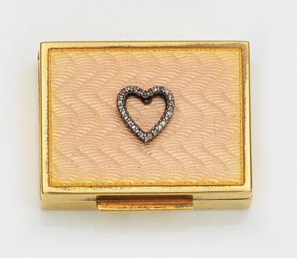 im Stil von Karl Fabergé. Silber, vergoldet und emailliert. Rechteckiger Korpus. Scharnierter Deckel, zentral besetzt mit durchbrochen gearbeitetem und mit Diamantrosen ausgefasstem Herz über hell lachsfarben emailliertem und wellenförmig guillochiertem Grund. Schmaler, gekanteter Drücker. Gest. 88. Gew. ca. 40 g. H. 1,2 cm. 3,8 cm x 2,8 cm.