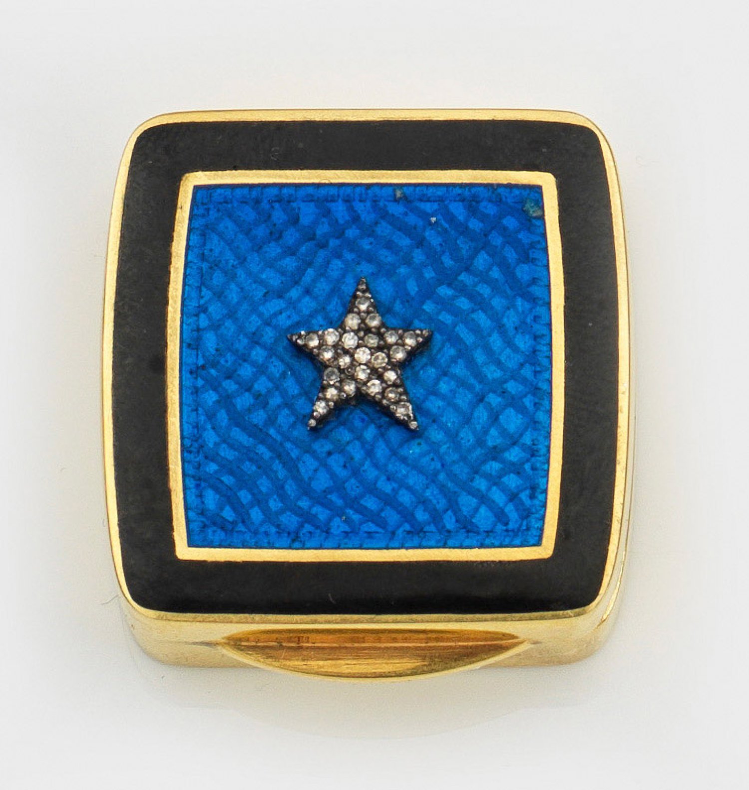 im Stil von Karl Fabergé. Silber, vergoldet und emailliert. Quadratischer Korpus mit gerundeten Ecken. Scharnierter Deckel, zentral besetzt mit kleinem, appliziertem Stern, ausgefasst mit Diamantrosen über royalblau emailliertem und netzartig guillochiertem Grund. Umlaufend ein schwarz emaillierter Rahmen mit goldener Profillinie. Gest. 88. Gew. ca. 40 g. H. 1,2 cm. 2,8 cm x 2,8 cm.