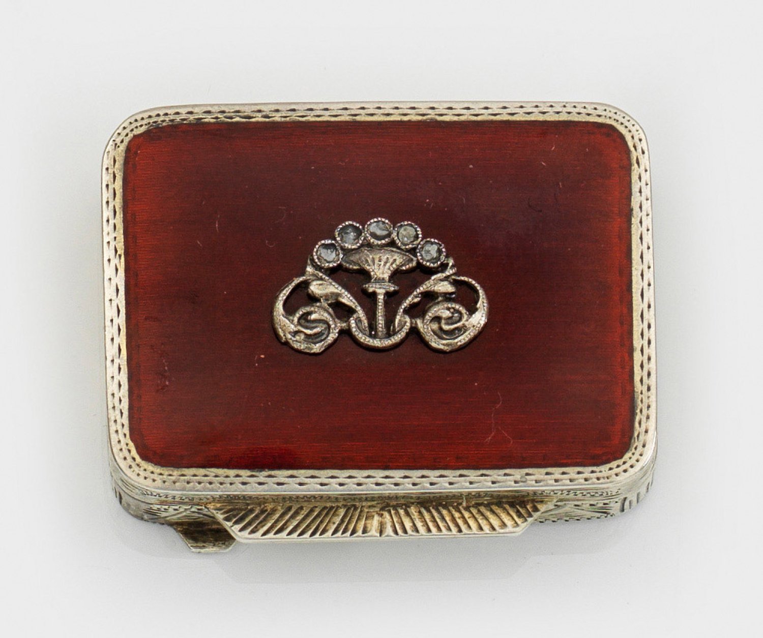 im Stil von Karl Fabergé. Silber, teilw. emailliert. Rechteckiger Korpus mit gerundeten Ecken. Scharnierter Deckel mit appliziertem, vasenförmigem Ornament getragen von zwei Voluten und ausgefasst mit Diamantrosen über rot emailliertem Grund. Gest. 88. Gew. ca. 25 g. H. 1,2 cm. 3,9 cm x 3 cm.