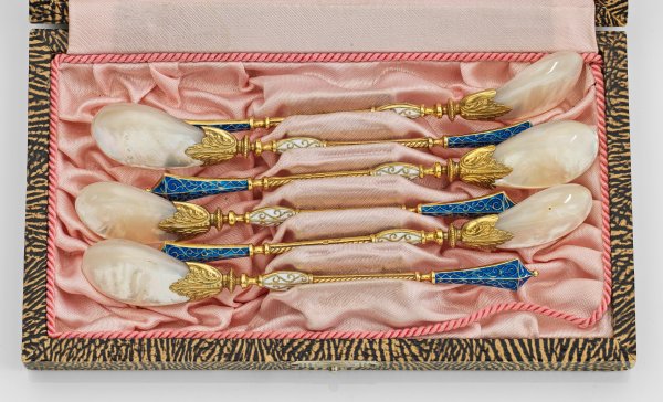 mit Etui. Silber, vergoldet und emailliert. Tropfenförmige Laffe aus Perlmutter. Langer, schmaler, spiralförmig gedrehter Griff mit spitzem, blau emailliertem Abschluss. Zunge in Form eines Blattes gearbeitet. Gest. 88. Gew. zus. ca. 120 g. L. 14 cm.