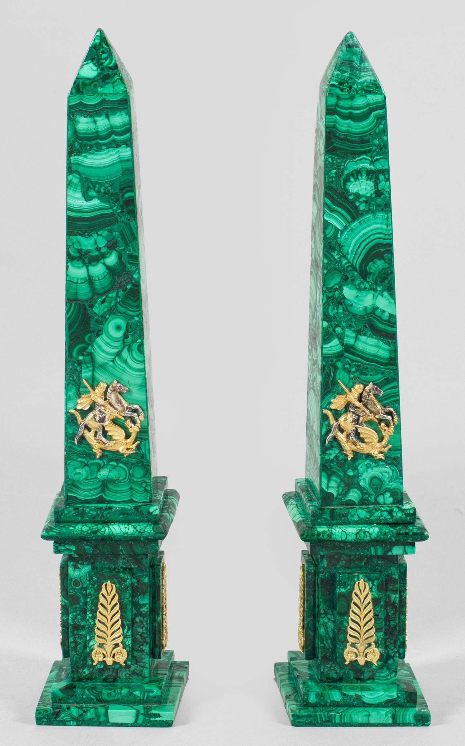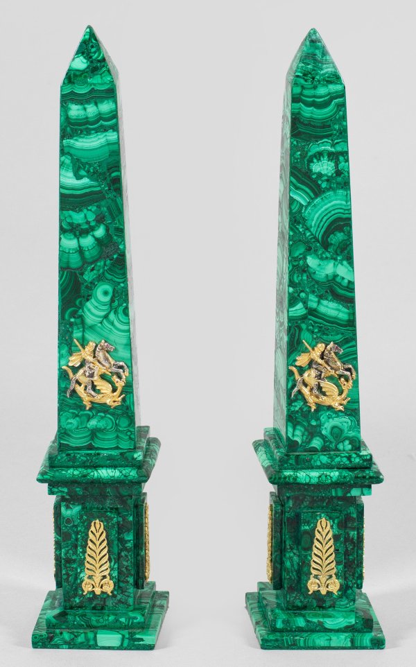 A pair of Russian malachite obelisks set with gilt silver applications. Standard mark 84.