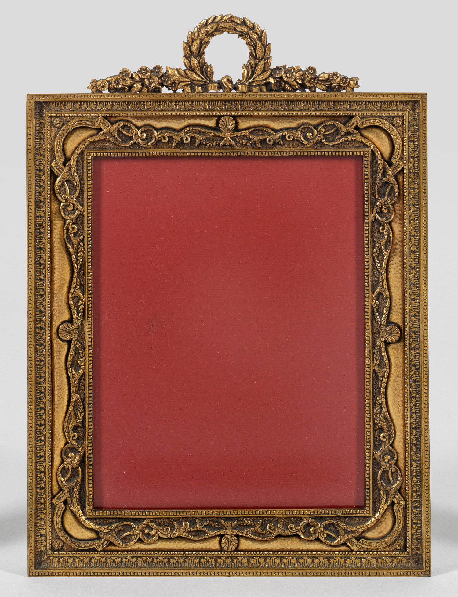 Bronze, vergoldet. Hochrechteckige, gekehlte und profilierte Rahmung. Der Rand mit Blattfries und -ranken, stilisierten Muscheln und Hammerschlagdekor verziert. Rahmenbekrönung in Form eines reliefplastisch und durchbrochen gestalteten Lorbeerblattkranzes, flankiert von Blütenranken. Rückseitig aufstellbar. 41,5 cm x 29,5 cm. Bildausschnitt: 20 cm x 26 cm.
