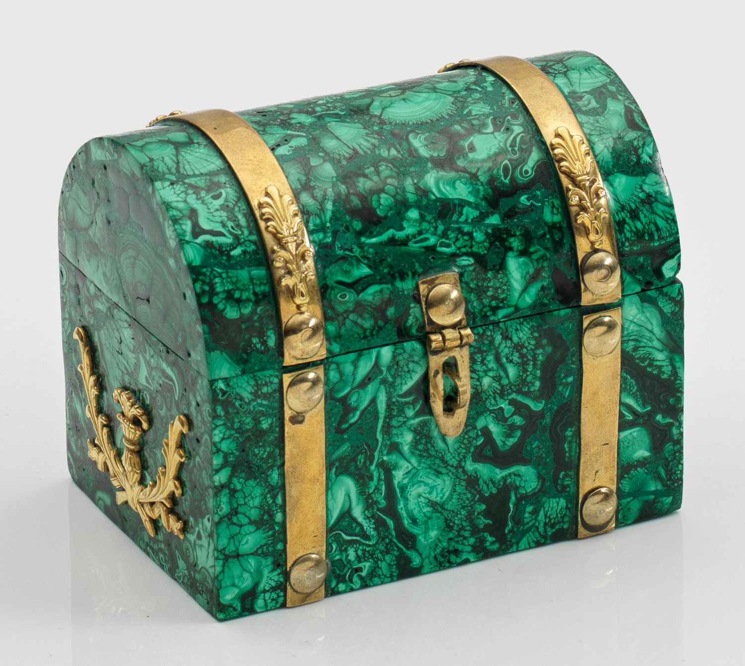 A Russian malachite box in the shape of a chest applied with brass and gilded silver. Inside two coins. Standard mark 84.