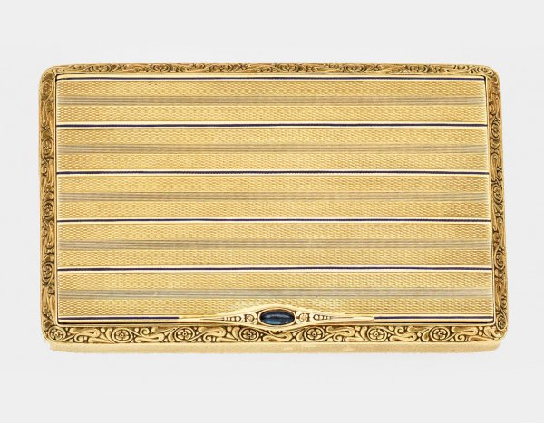 Gelbgold. Flache, rechteckige Form mit abgeschrägten Kanten und gerundeten Ecken. Beidseitig flächendeckend verziert mit feinem guillochiertem Linear- und Wellendekor sowie auf dem scharnierten Deckel alternierend mit zarten, dunkelblau emaillierten Zierlinien. Die abgeschrägten Kanten verziert mit stilisierten Blattvoluten und Blüten. Schauseitiger Drücker besetzt mit einem querovalen Saphircabochon, flankiert von korrespondierendem Floraldekor. Gest. 585. Gew. ca. 85 g. H. 0,8 cm. 7,5 cm x 4,7 cm.