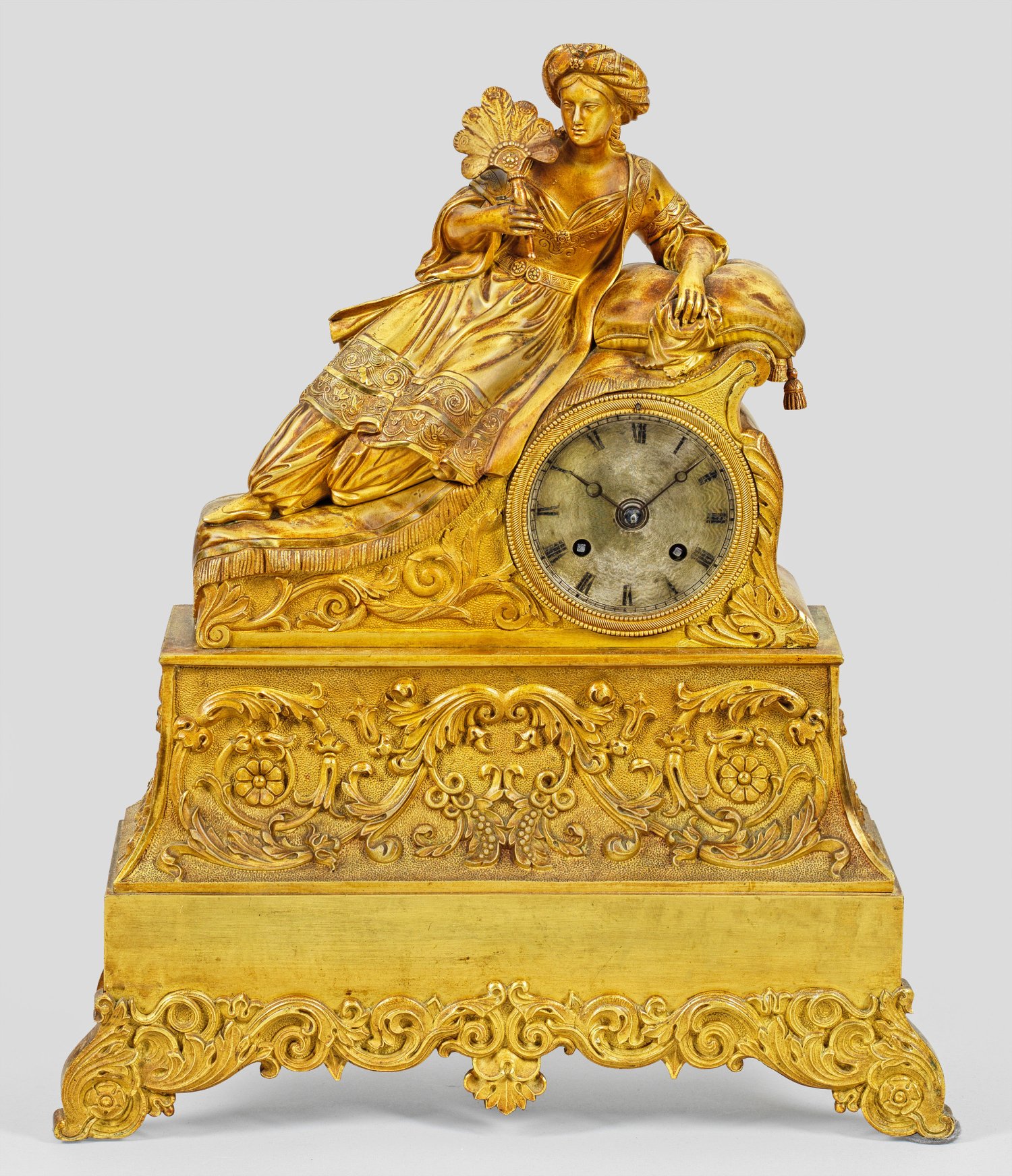 Bronze. Vollplastische Darstellung einer ruhenden Orientalin mit Fächer, auf das Uhrengehäuse gestützt. Profilgerahmtes, guillochiertes Zifferblatt sowie Pendulenwerk mit Fadenaufhängung und Halbstundenschlag auf Glocke. Unterhalb hoher Podestsockel mit erhaben reliefierten, eingerollten Voltuten. H. 44 cm. 34 cm x 11 cm.