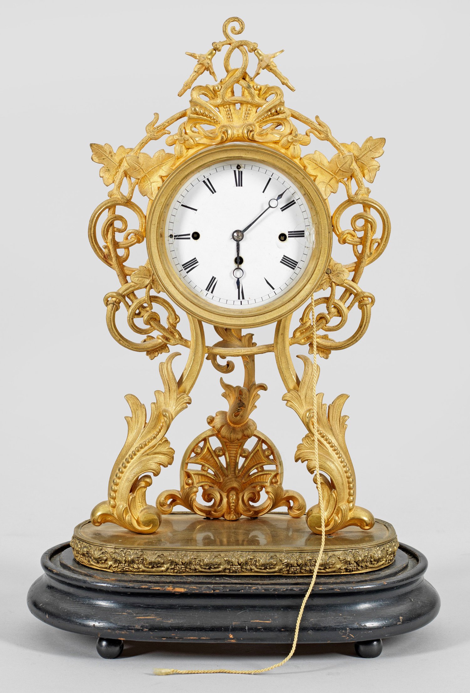 Messing, Bronze und ebonisiertes Holz. Über profiliertem Sockel durchbrochen gearbeiteter Korpus aus Weinreben als Träger für rundes Uhrengehäuse. Werk mit Viertelstunden-Schlagwerk auf zwei Tonfedern und Repetition. Überholungsbedürftig. Pendel fehlt. H. 47 cm. 30 cm x 18 cm.