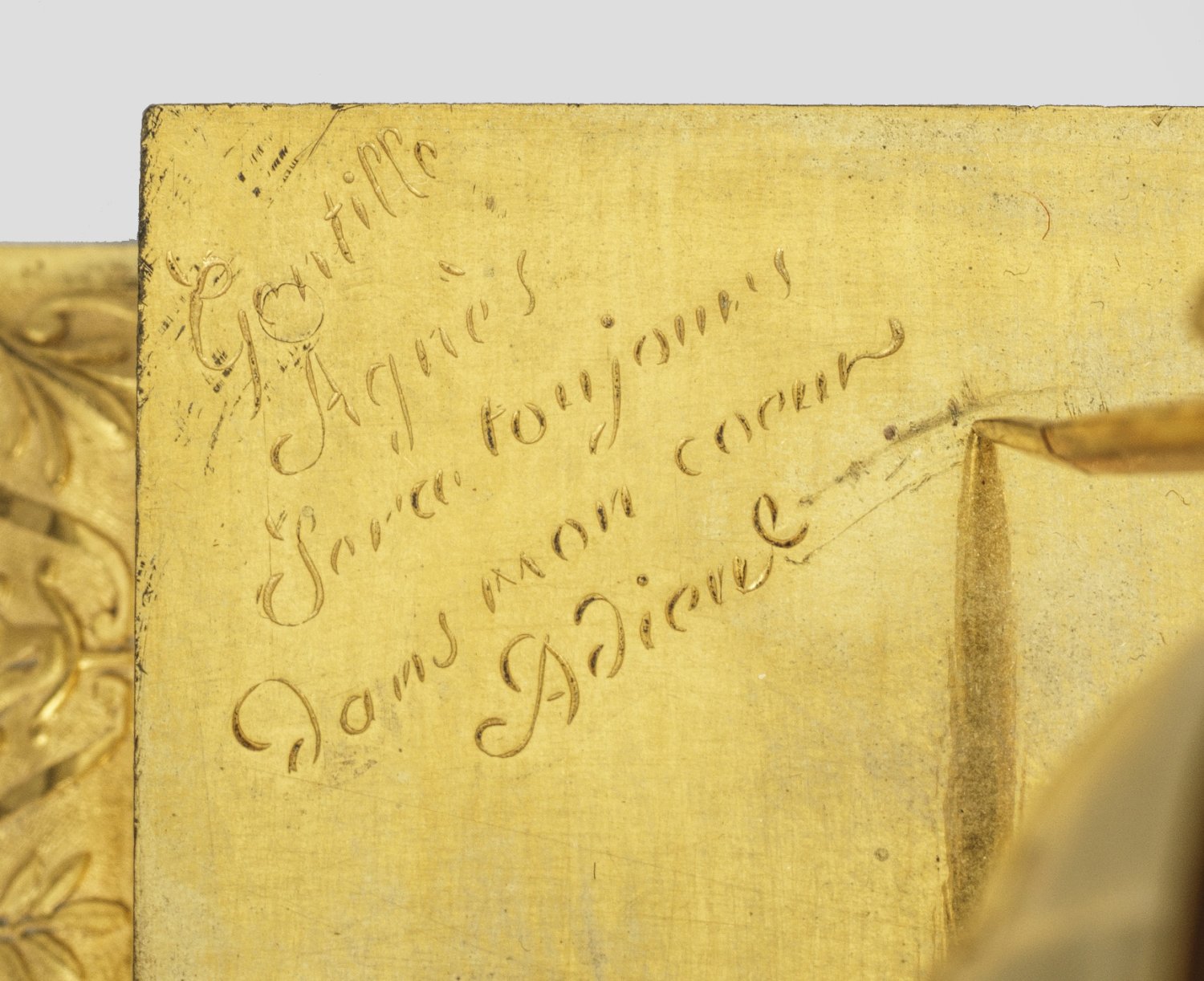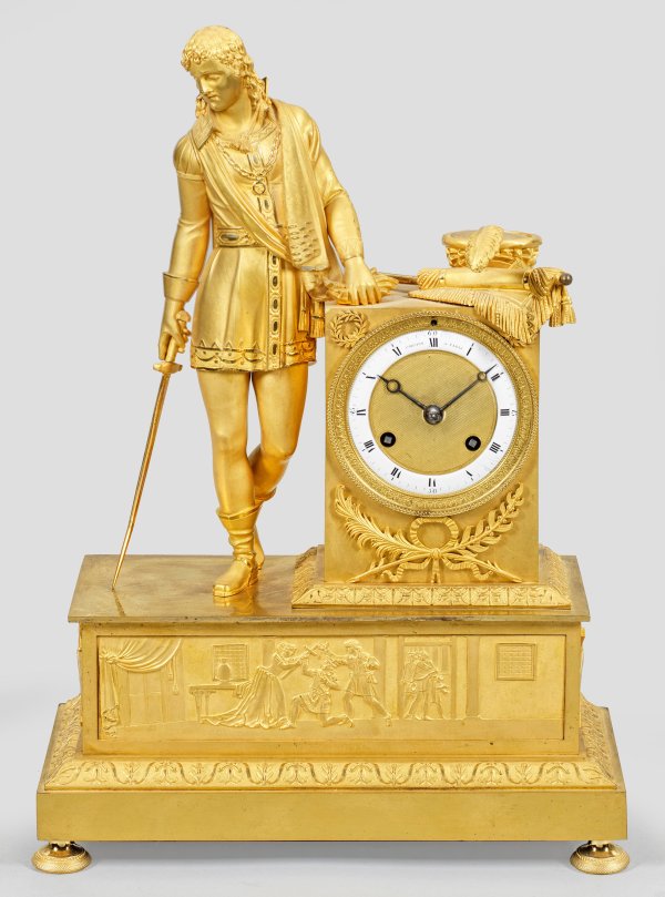 Bronze, vergoldet. Vollplastische Darstellung eines jungen Edelmannes mit seinem Schwert einen Sinnspruch in den Boden schreibend. Im querrechteckigen Sockel korrespondierender, szenisch angelegter Figurenfries. Profilgerahmtes Zifferblatt mit Emailziffernring, bez. Chopin à Paris. Pendulenwerk mit Fadenaufhängung sowie Halbstundenschlag auf Glocke. H. 40,5 cm. 28 cm x 13 cm.