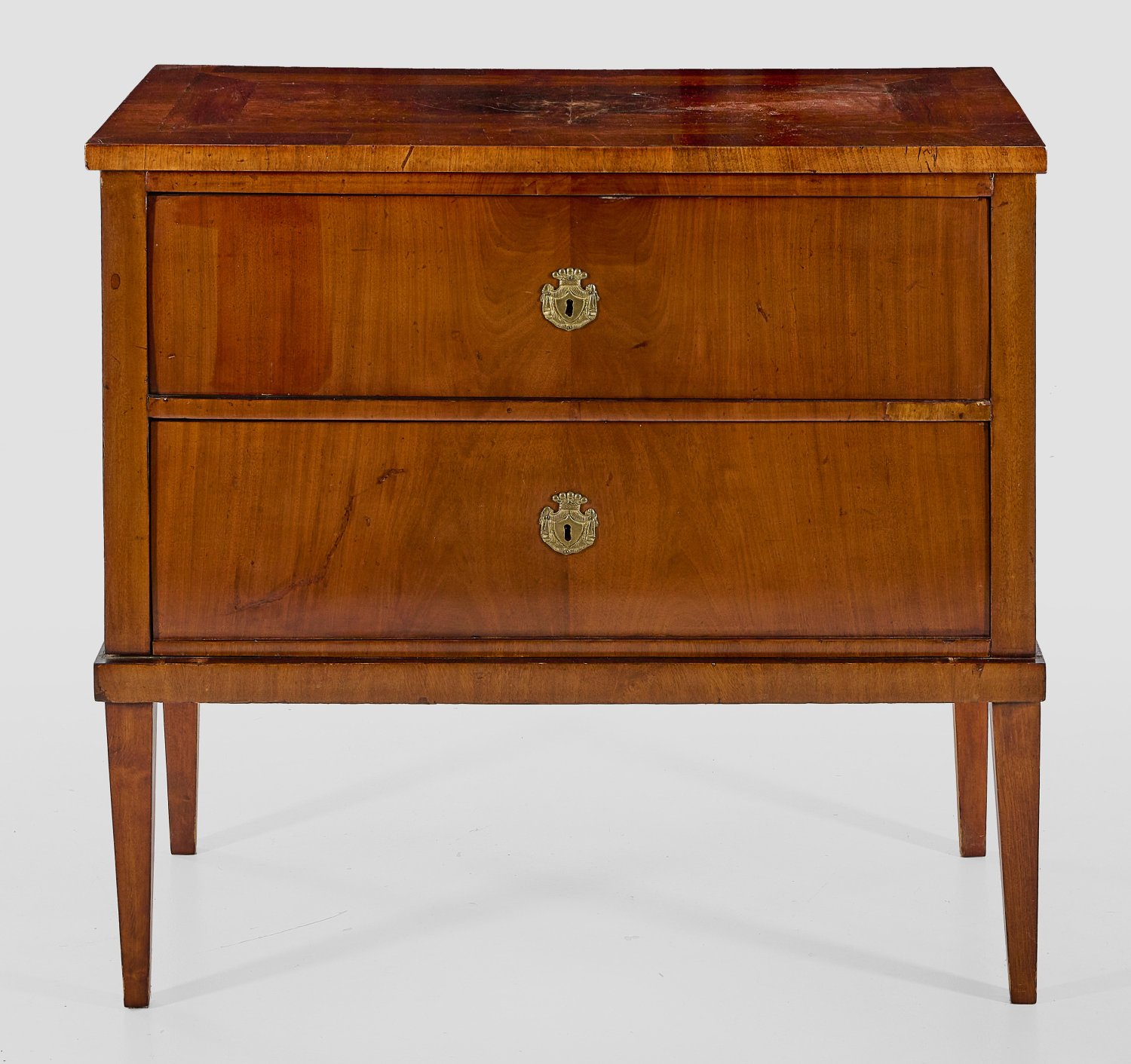 Mahagoni, furniert. Gerader, querrechteckig angelegter Korpus auf konischen Vierkantbeinen. In der gegliederten Front zwei Schubladen. Gering überstehende Deckplatte. Erg.; H. 82,5 cm. 89,5 cm x 46 cm.