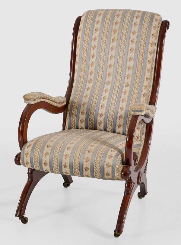 Mahagoni. Offen gestalteter Korpus aus gegeneinander gestellten Volutenarmlehnen sowie hoher, zurückschwingender Rückenlehne auf gebogten Beinen mit Rollen. Gepolstert und bezogen. H. 108 cm. 66 cm x 84 cm. Sitz-H. 45 cm.