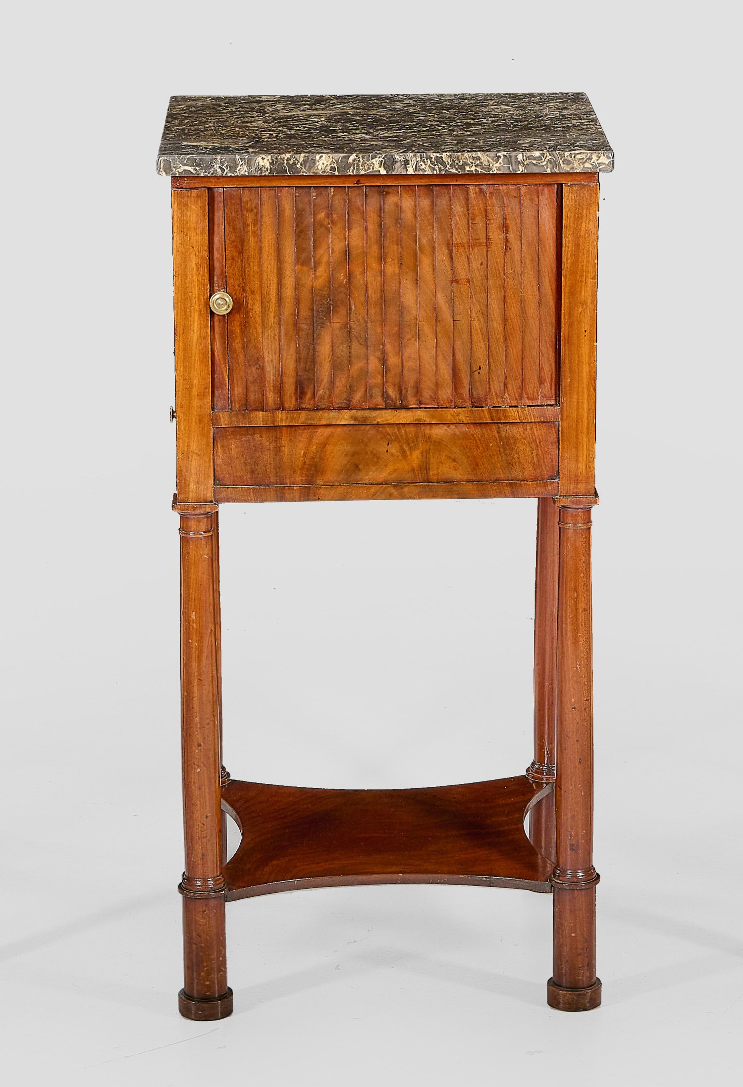 Mahagoni, massiv und furniert. Gerader Korpus mit seitlichem Schubfach auf konischen Säulenschäften, unterhalb durch konkav eingezogenes Ablagefach verbunden. In der gegliederten Front Jalousieverschluss. Gering überstehende Deckplatte aus dunkelgrauem, hellgrau gemasertem Marmor. H. 80,5 cm. 40 cm x 34 cm.