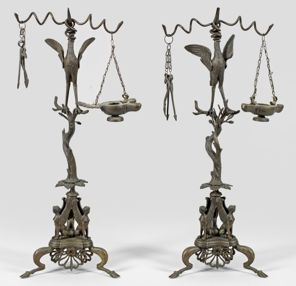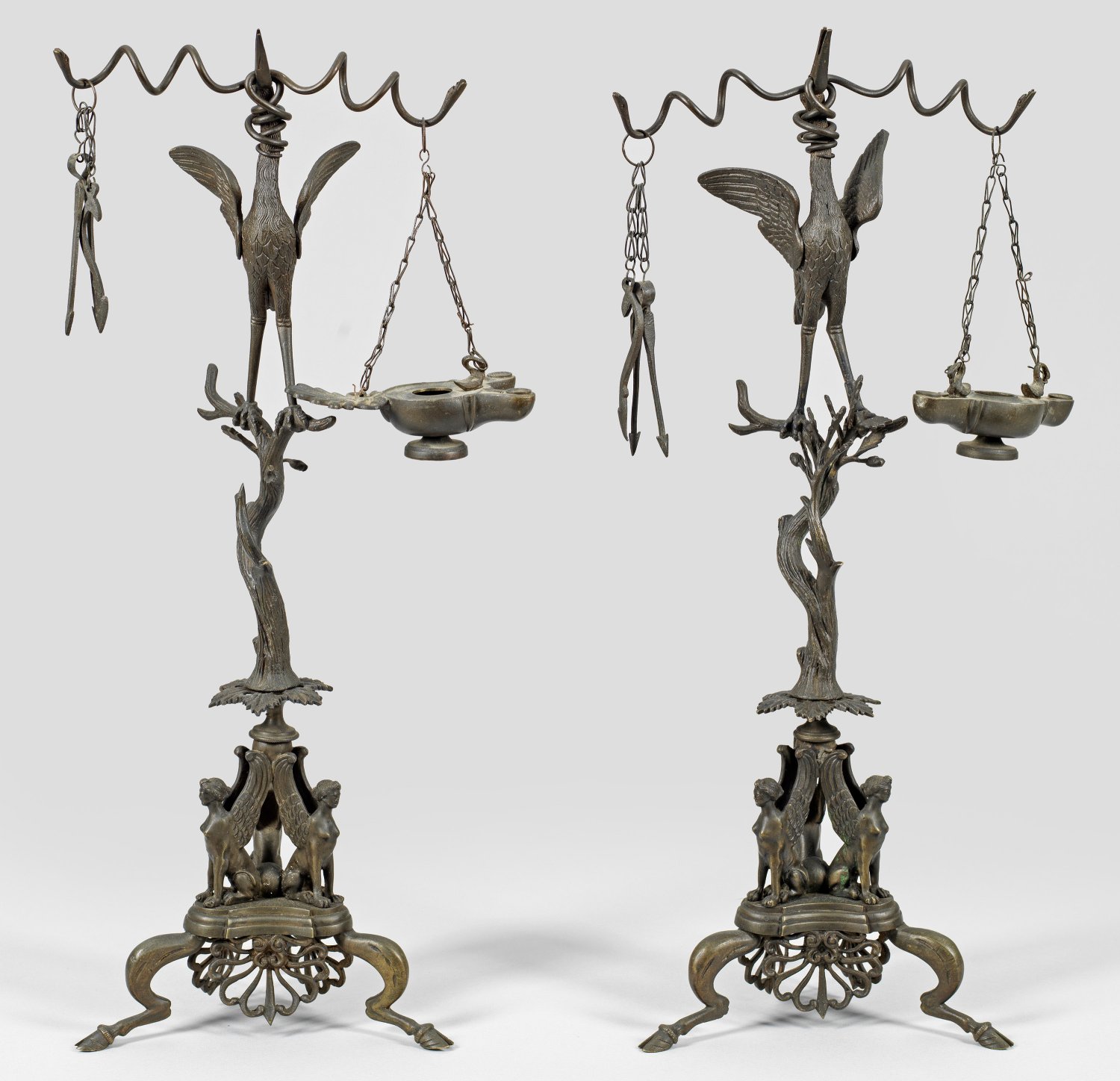 2-flg.; Bronze, dunkel patiniert. Über stark geschwungenen Bocksbeinen. Gestuft ansteigende Sockelplatte mit durchbrochen gearbeiteten Palmettenmotiven. Oberhalb drei vollplastisch gestaltete Chimären als Träger für naturalistisch gestalteten Schaft aus Astwerk. Große Kranichfiguren mit stark geschwungenem Schlangenpaar als Träger für Leuchtmittel als kleine Öllampe an Kettengliedern. H. 50 cm.