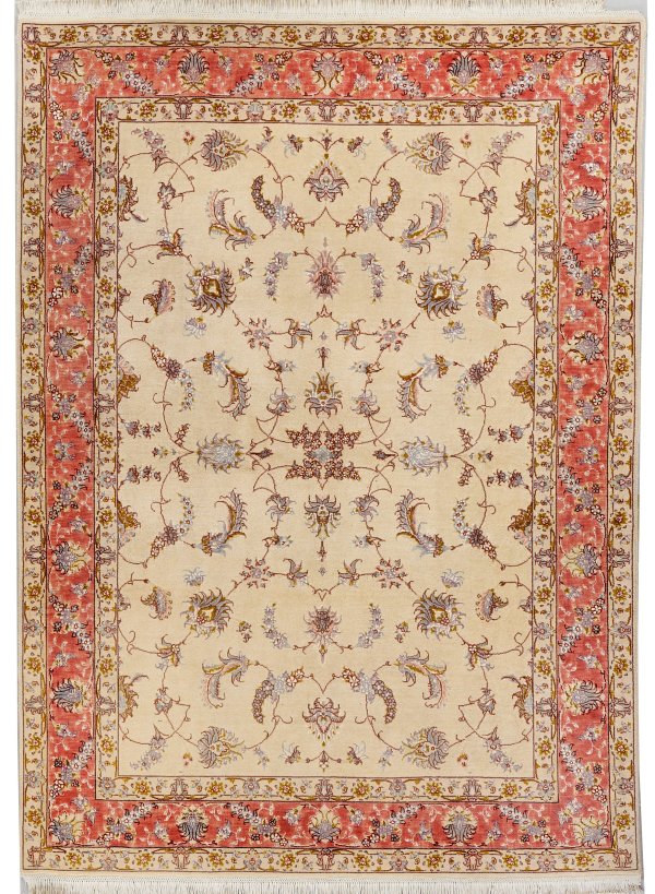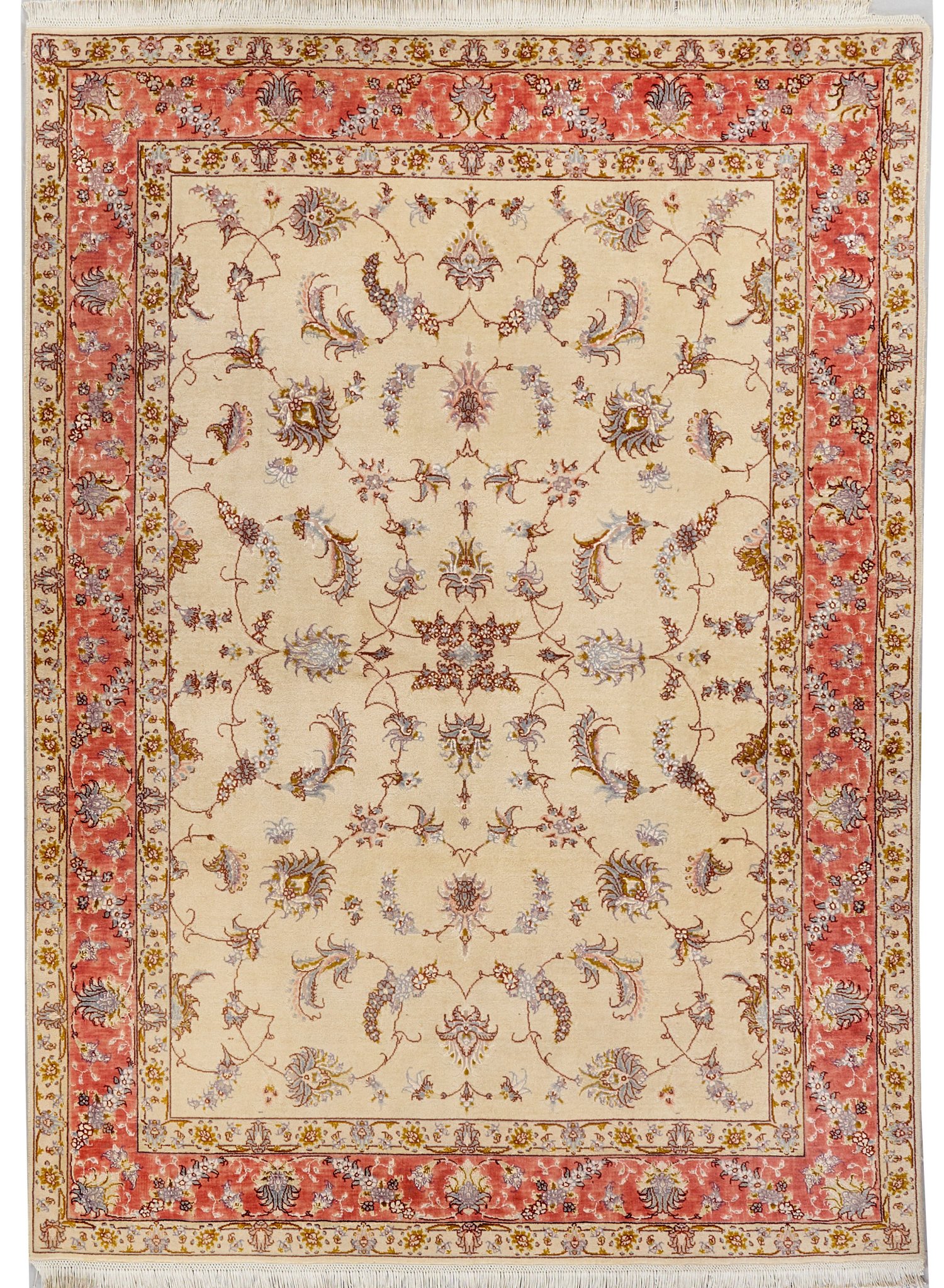 Persien. Korkwolle mit Seide auf Baumwolle. Im cremefarbenen Innenfeld flächendeckende Musterung aus schlanken Palmettenranken. Umlaufend breite, hellrote Bordüre aus Palmetten und Blütenrispen, flankiert von schmalen Bändern. 197 cm x 149 cm.