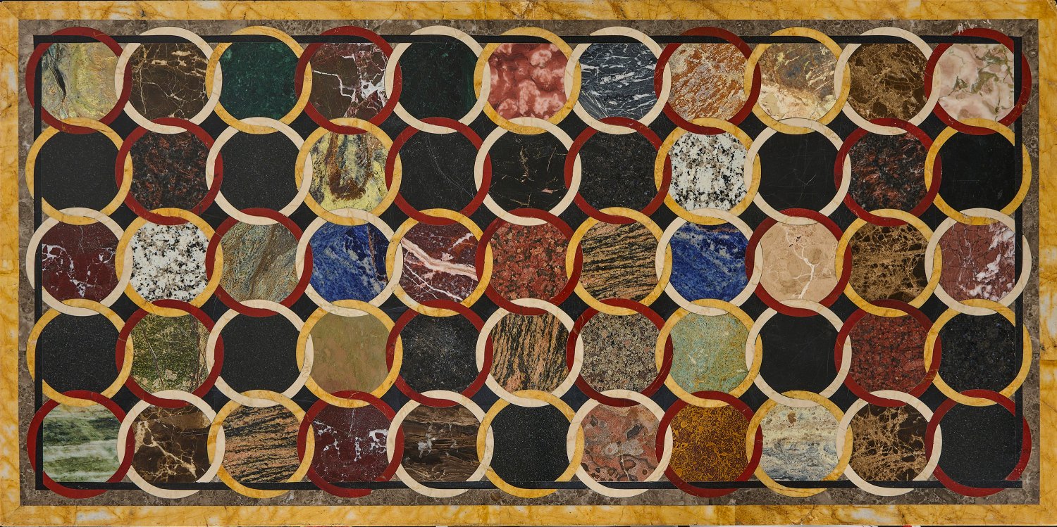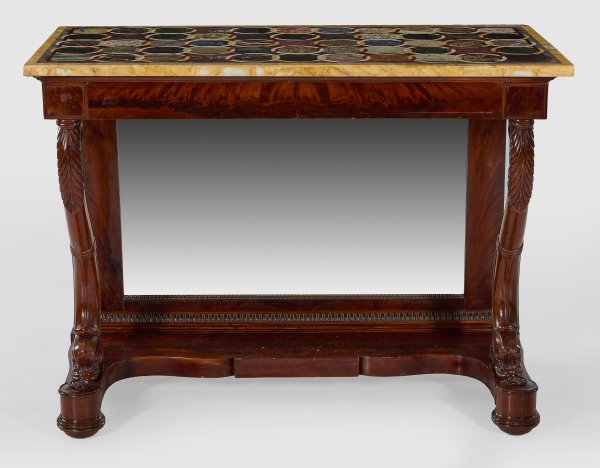 Mahagoni, massiv und furniert sowie unterschiedliche Marmorsorten wie u.a. "Crema Valencia", rot gemaserter "Rouge Royal", "Rosso Collemandi" und "Duchessa Rosada", grün gemaserter "Verde Patricia", diverse Granitsorten wie u.a. "Rosa Prorrino" und "Bianco Sardo" sowie Lapislazuli. Über stark eingezogener Sockelplatte volutenartige Streben aus stilisierten Delfinen sowie verspiegelte Rückwand als Träger für gerade Zarge. Schlagstempel-Sign. PETERS MAKER GENOA (tätig 1817-1852). Gering überstehende, rechteckige Deckplatte mit flächendeckendem Mosaikdekor aus Kreiselementen und verschlungenen Ringmotiven, von schmalen Bändern begrenzt in sog. Pietra Dura-Technik. H. 96 cm. 127 cm x 63 cm.