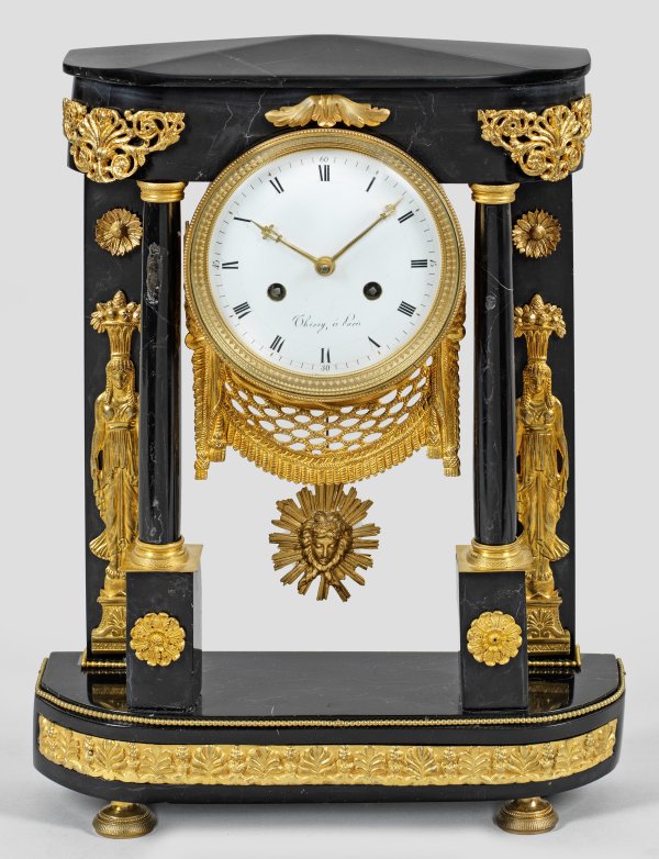 Schwarzer Marmor und vergoldete Bronze. Architektonisch gegliedertes Uhrengehäuse aus Vollsäulen und gekanteten Pilastern mit applizierten Karyatiden. Verglastes Emailzifferblatt, bez. Thiery à Paris. Pendulenwerk mit Fadenaufhängung und Halbstundenschlag auf Glocke. Teilw. rest.; H. 41 cm. 30,5 cm x 9,5 cm.