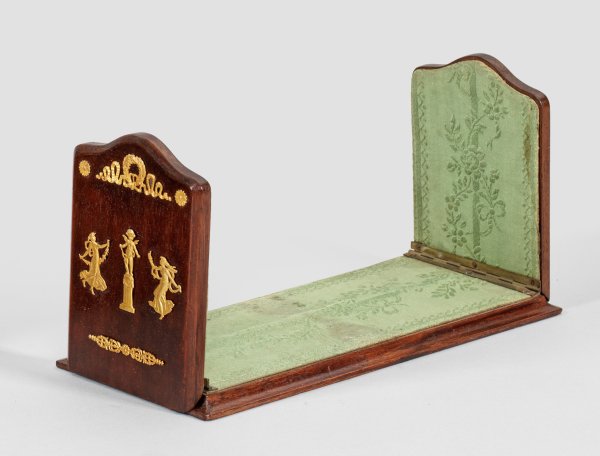 Mahagoni mit Applikationen aus vergoldetem Messing. Rechteckige, profilierte Fläche mit aufstellbaren, gerundeten Seitenteilen. Grüne Jaquard-Auskleidung. Figürliche Applikationen aus Amoretten und Tänzerinnen. L. 29 cm.