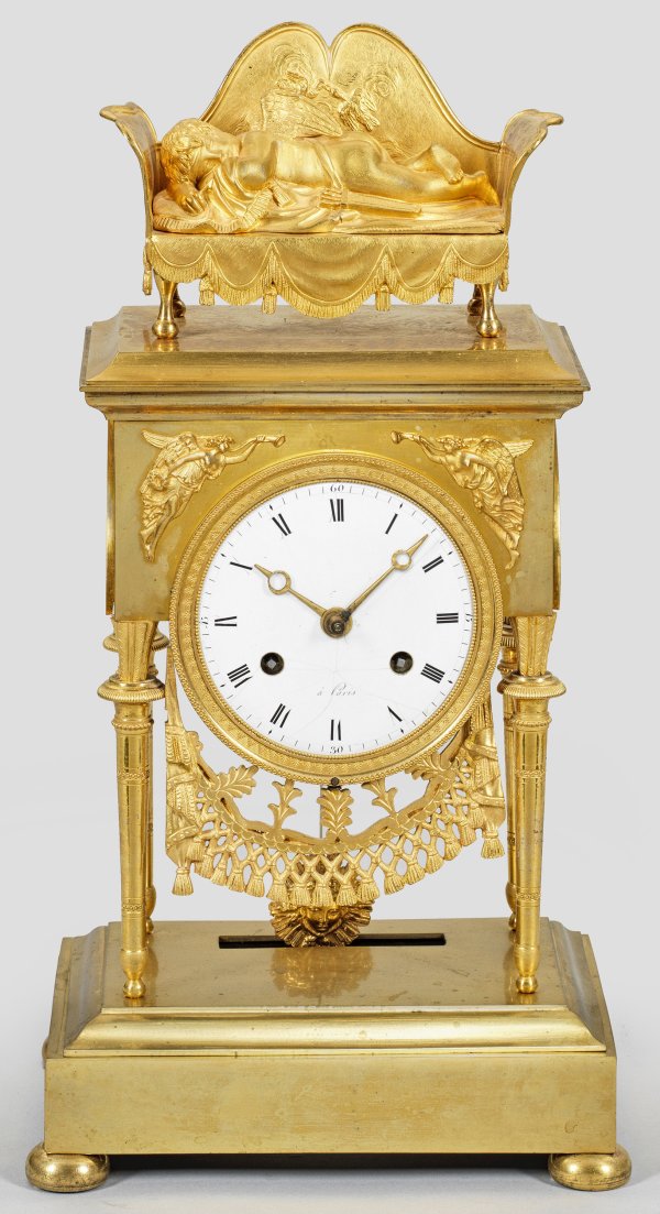 Bronze. vergoldet. Über profiliertem Sockel mit gedrückten Füßen architektonisch gegliedertes Gehäuse aus köcherartigen Säulen. Profilgerahmtes, besch. Emailzifferblatt bez. à Paris sowie unterhalb üppiges Draperiewerk. Skulpturale Bekrönung in Gestalt des schlafenden Amors auf einem Sofa mit erhaben reliefiertem, schnäbelndem Taubenpaar in der Lehne. Pendulenwerk mit Fadenaufhängung sowie Halbstundenschlag auf Glocke. H. 41 cm. 20,5 cm x 14 cm.