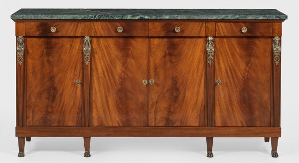 Mahagoni, furniert. Gerader, querrechteckig angelegter Korpus auf schmaler Zarge und konischen Vierkantbeinen mit Tatzenfüßen. In der gegliederten Front vier Türen, flankiert von eingestellten weiblichen Karyatiden sowie oberhalb leicht vorkragende Schubfächer. Deckplatte aus grün gemasertem Marmor. H. 106 cm. 200 cm x 51 cm.