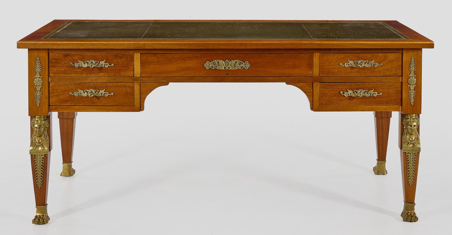 Mahagoni, furniert sowie Applikationen aus vergoldeter Bronze. Gerader, rechteckiger Korpus auf konischen Vierkantbeinen mit plastisch gestalteten Karyatiden. In der gegliederten Front breites Kniefach, umgeben von fünf Schubladen unterschiedlicher Größe. Rückseitig entsprechende Blendschubladen. Gering überstehende Deckplatte mit eingelegter Arbeitsfläche aus grünem, goldgeprägtem Leder sowie seitlich korrespondierende, ausziehbare Ablageflächen. H. 78,5 cm. 175 cm x 84 cm.