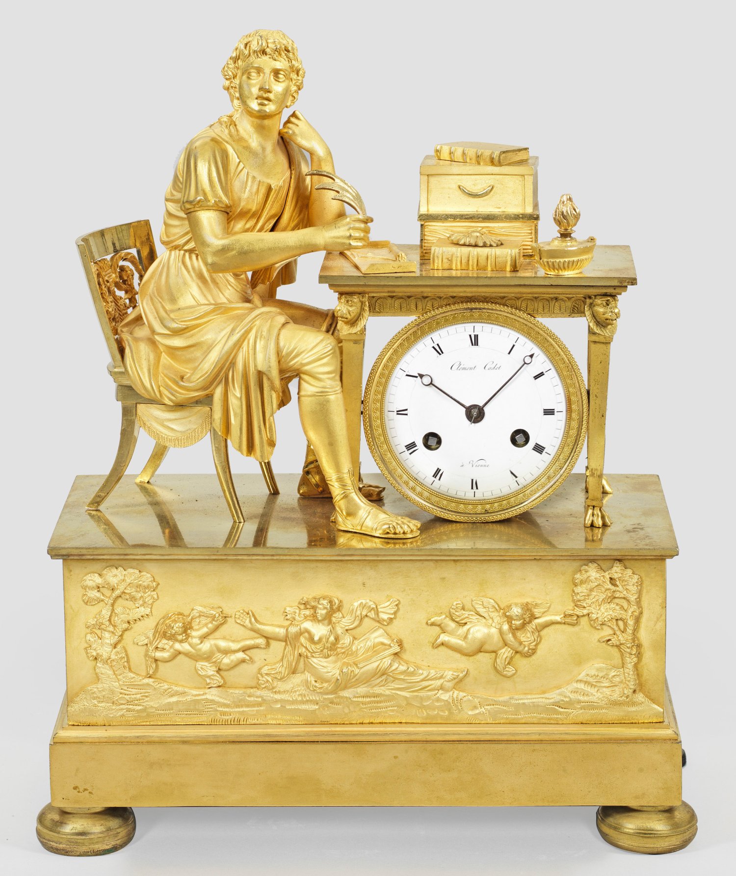 Bronze, vergoldet. Vollplastische Darstellung eines jungen, in die Ferne blickenden Gelehrten mit Büchern und Schreibfeder an einem Tisch sitzend. Unterhalb im breiten, querrechteckig angelegtem Sockel korrespondierende, erhaben reliefierte Szenerie mit in unterschiedliche Richtungen davonfliegenden Amoretten und junger, idealisierter Dame. Profilgerahmtes Emailzifferblatt bez. Clément Cadet à Vienne. Pendulenwerk mit Fadenaufhängung sowie Halbstundenschlag auf Glocke. H. 38 cm. 29,5 cm x 14 cm.