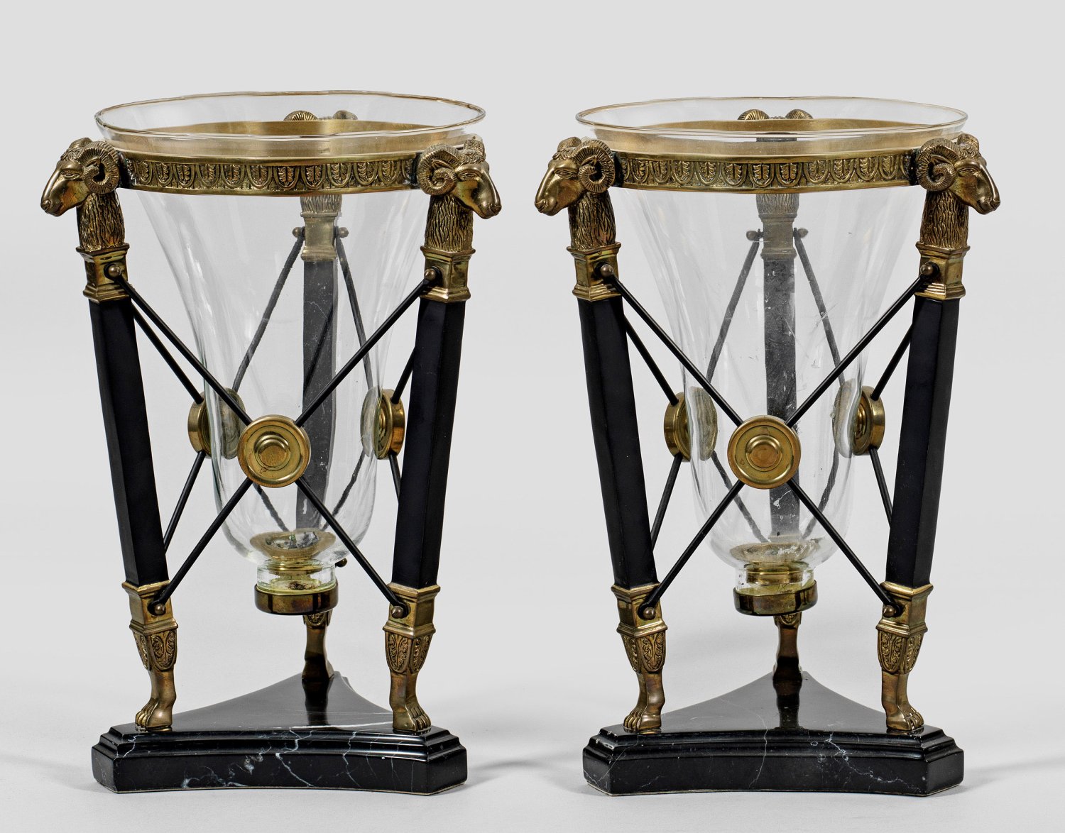 sog. Hurricanes. 1-flg.; Schwarzer, weiß gemaserter Marmor, Messing, teilw. dunkel patiniert und farbloses Glas. Über dreiseitig konkav eingezogener Sockelplatte schräggestellte Streben mit plastischen Widderköpfen, durch kreuzförmige Streben verbunden. Schmaler Reif als Träger für kelchförmigen Korpus. H. 39 cm.