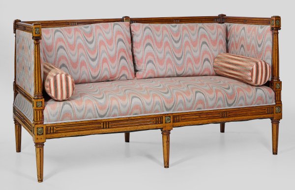 Mahagoni. Gerade Zarge auf kannelierten Balusterbeinen. Gerade, profilierte Rücken- und Lehnenrahmung, flankiert von schlanken, eingestellten Säulen mit ionischen Kapitellen. Gepolstert und schauseitig bezogen. Rosettenförmige Applikationen aus Messing. H. 95 cm. 171 cm x 80 cm. Sitz-H. 48 cm.