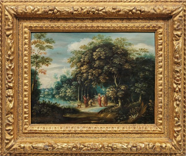 Blick auf eine baumbestandene, flämische Ideallandschaft mit einem tunnelartigen Weg durch einen Wald, auf einer Lichtung im Vordergrund in der Bildmitte eine kleinfigurig gemalte Figurengruppe: Christus mit den zwei Jüngern auf dem Weg nach Emmaus, die von einem sich ehrerbietig niederknienden Mann und zwei stehenden Männern (bzw. Soldaten) mit Lanzen angehalten werden. Das in den Details des Laubes in den Bäumen und in den Blumen im Vordergrund feinmalerisch ausgeführte, subtil tiefenräumlich gestaffelte Kabinettbild verweist aufgrund des Motivs, der Komposition und des Stils auf den flämischen Meister Abraham Govaerts. Dieser gehörte zu den angesehenen Landschaftsmalern Antwerpens, er war von Jan Brueghel d. Ä. und Gillis van Coninxloo (III) beeinflusst, wurde 1607 Meister in der Gilde und 1623 zu deren Dekan gewählt. Bei der Figurenstaffage arbeitete er - wie es in Antwerpener Malerei des 16. Jhs. allgemein üblich war - oft mit anderen bedeutenden Künstlern zusammen, insbesondere mit Frans Francken dem Jüngeren. Öl/Kupfertafel. 23,5 cm x 31 cm. Rahmen.