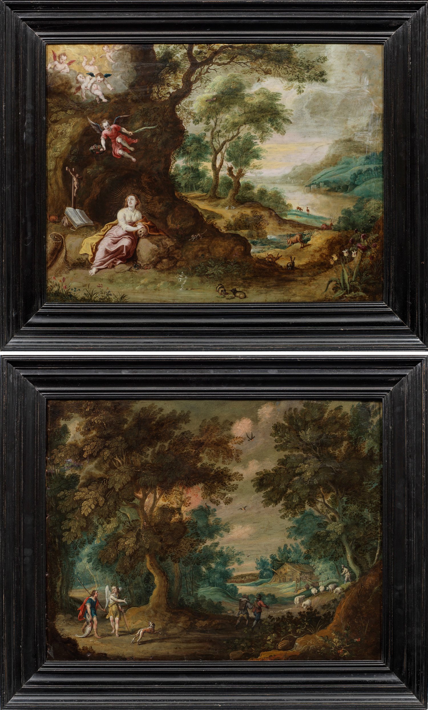 A pair of landscapes with the penitent Mary Magdalene and Tobias and the angel Raphael travelling. Oil on copper.