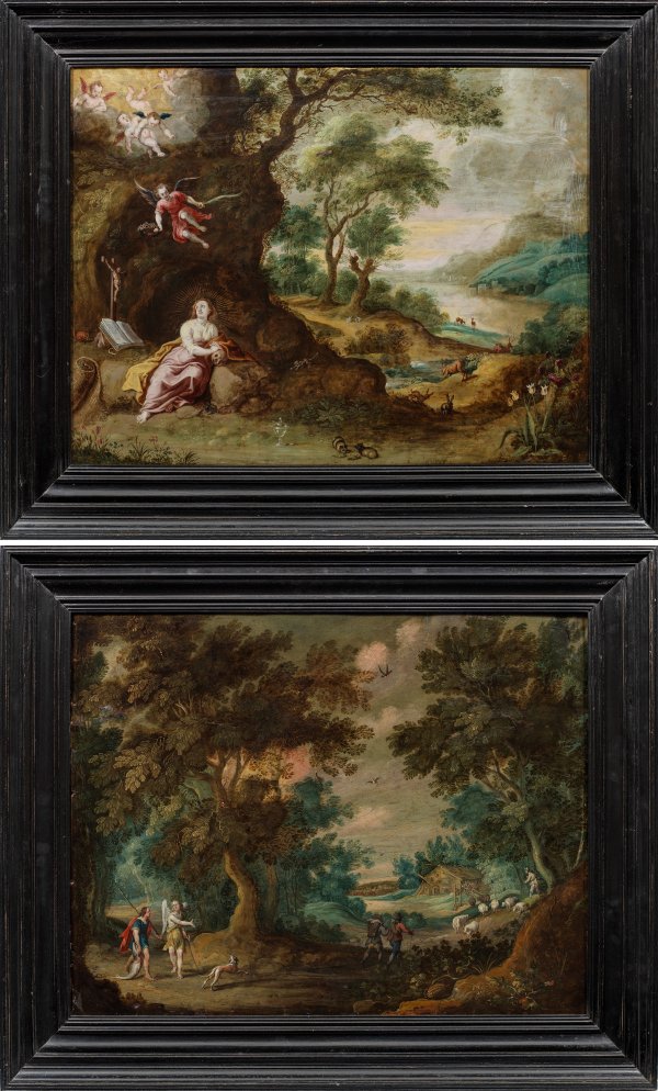 Gegenstücke. Unterhalb eines baumbestandenen Felsens sitzt Maria Magdalena mit offenem, langem Haar und Strahlennimbus, gewandet in ein purpurnes Kleid, halbtransparenter, weißer Bluse und einem goldgelben Mantel, die Hände auf einen Totenschädel gelegt. Sie blickt zum Himmel, wo sich vier kleine Engel in den Wolken tummeln, direkt über ihr schwebt ein größerer Engel mit einer Märtyrerpalme und einem Kranz aus Rosen. Zu ihrer rechten Seite hat Maria Magdalena ein Kruzifix aufgestellt, davor die Bibel gelegt; ein weiteres Symbol für ihre Bußfertigkeit ist die am linken Bildrand stehende Stoffrolle aus grob gewebtem Tierhaar, aus dem sie künftig ihr härenes Gewand tragen wird. Ihr Glaube schützt Maria Magdalena auch vor drohenden Gefahren wie dem rattenartigen Untier, das sich ihr von rechts nähert. Auf der rechten Bildseite geht der Blick auf ein tiefes, idyllisches Flusstal, zu dem Hasen und Hirsche hinabziehen. Während diese Tiere und auch das Eichhörnchen neben dem Kruzifix der europäischen Fauna entstammen, hat der Maler im Vordergrund mittig zwei exotische, seinerzeit luxuriöse Meerschweinchen mit Bohnen als Futter platziert. Das andere Gemälde schildert Tobias mit dem Fisch und seinem Hund als Reisegefährten, in Begleitung des ihn beschützenden und leitenden Erzengels Raphael. Es zeigt sie auf dem Weg nach Ekbatana oder auf dem Heimweg im Moment, indem sie aus einem dichten Eichenwald heraustreten und der Hund voran springt. Auf der rechten Bildseite öffnet sich die Landschaft, auch zwei weitere Wanderer streben zu einem Gehöft, vor dem ein Schäfer seine Herde grasen lässt. Adriaen van Stalbemt gehörte neben Jan Brueghel (Breughel) d. J. zu den besten und bedeutendsten Malern in der Nachfolge Jan Brueghel d. Ä., der ihn insbesondere in seinen Landschaften nachhaltig prägte. 1610 wurde er als Meister in die Lukasgilde seiner Heimatstadt Antwerpen aufgenommen, der er 1618/19 auch vorstand. Als renommierter und erfolgreicher Maler schuf er ein umfangreiches Ouevre, das heute noch ca. 330 dokumentierte Gemälde umfasst. Werke des Künstlers befinden sich u. a. in Museen in Amsterdam, Antwerpen, Berlin, Köln, Leipzig und Schwerin. Öl/Kupfertafel. 50 cm x 65 cm. Rahmen.