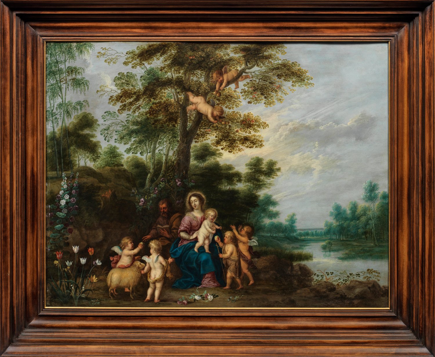 Darstellung der Hl. Familie mit dem Johannesknaben, Engeln und dem Lamm in einer idyllischen, baumbestandenen, flämischen Landschaft am Ufer eines Flusses. Die Hl. Familie sitzt unterhalb eines Apfelbaumes, von dem zwei Engel die Früchte pflücken, die von Johannes an das freudig begierige Kind bzw. von einem dritten Engel an den lesenden Josef weitergereicht werden; auf der linken Bildseite deutet ein von einem Engel geführtes Lamm (Gottes) bereits die spätere Passion an. Der hinter der Hl. Familie wachsende Rosenstock, die am Boden liegenden Rosenstängel, die blühenden Tulpen und Stockrosen werden als Blumen mit teilw. tiefem, symbolischem Gehalt geschildert. Das fein lasierend ausgeführte Gemälde gehört zu einer größeren Werkreihe von Gemälden mit Darstellungen der Hl. Familie in Landschaften von Jan Breughel dem Jüngeren. Die Figuren dürften mit großer Wahrscheinlichkeit von Pieter van Avont (1600 Mecheln - 1652 Antwerpen) stammen, der ebenso wie der ältere Hendrick van Balen (1573/75 - 1632) intensiv mit Breughel zusammenarbeitete. Von Pieter van Avont sind mehrere vergleichbare Kompositionen mit der Hl. Familie, Johannes dem Täufer als Kind, Engeln und dem Lamm in der Datenbank des RKD in Den Haag nachweisbar. Öl/Kupfertafel, alt befestigt auf einer Holztafel. Verso alte Bez.:"(...) Eden" u. altes Etikett mit handschriftlicher Bez: "Bought at Madrid June 1830". 55,6 cm x 72,4 cm. Rahmen.
