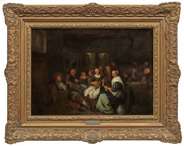 Vielfigurige Szene in einer Schenke mit unterschiedlichen, bürgerlichen und bäuerlichen Figuren, im Vordergrund eine Lautenspielerin, ein eleganter junger Mann mit Flöte und eine singende junge Frau mit Notenblatt. Motiv- und stiltypisches Tafelbild des bekannten, größtenteils in Haarlem und Amsterdam tätigen Genremalers, der mit Vorliebe fröhliche Gesellschaften schilderte. Zu den zahlreichen vergleichbaren, vom RKD dokumentierten Werken zählen u. a. Gemälde im Rijksmuseum in Amsterdam und Mauritshuis in Den Haag. Öl/Eichenholztafel. 41,5 cm x 58 cm. Rahmen.
