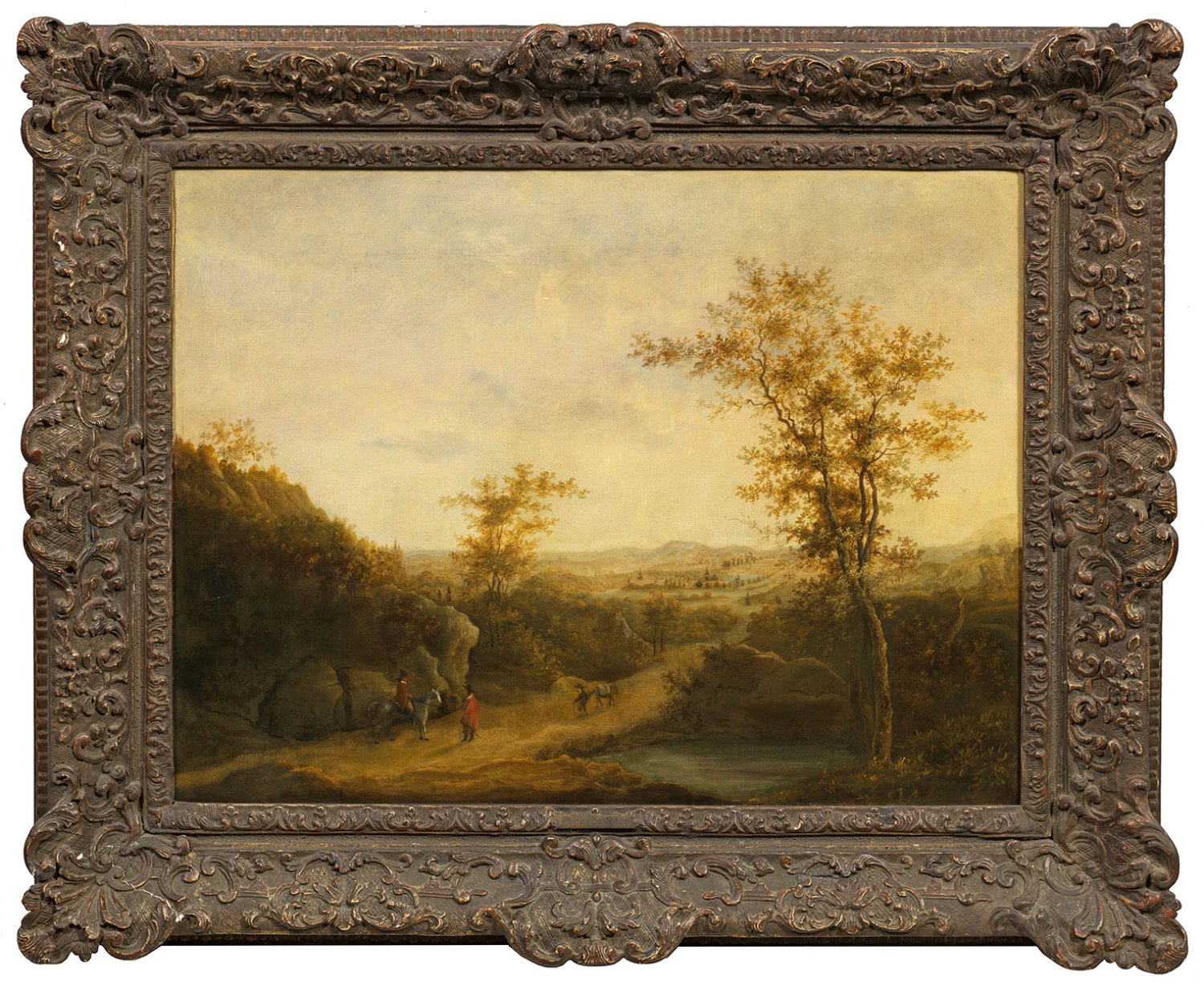 In Motiv und Stil charakteristisches Werk des Künstlers, der um 1650-1655 in Amsterdam bei Jan Asselijn lernte und danach bis 1659 Frankreich, Deutschland und Italien bereiste. Frederik de Moucheron schilderte neben italienisierenden Landschaften insbesondere baumreiche Landschaften mit Jagdgesellschaften und Hirten, deren Figurenstaffage oft von bedeutenden Künstlern wie Adriaen van de Velde, Nicolaes Berchem und Johannes Lingelbach stammt. Öl/Lwd., doubl.; L. u. Rest-Sign. mit undeutl. Dat.; 51,5 cm x 68,5 cm. Rahmen.