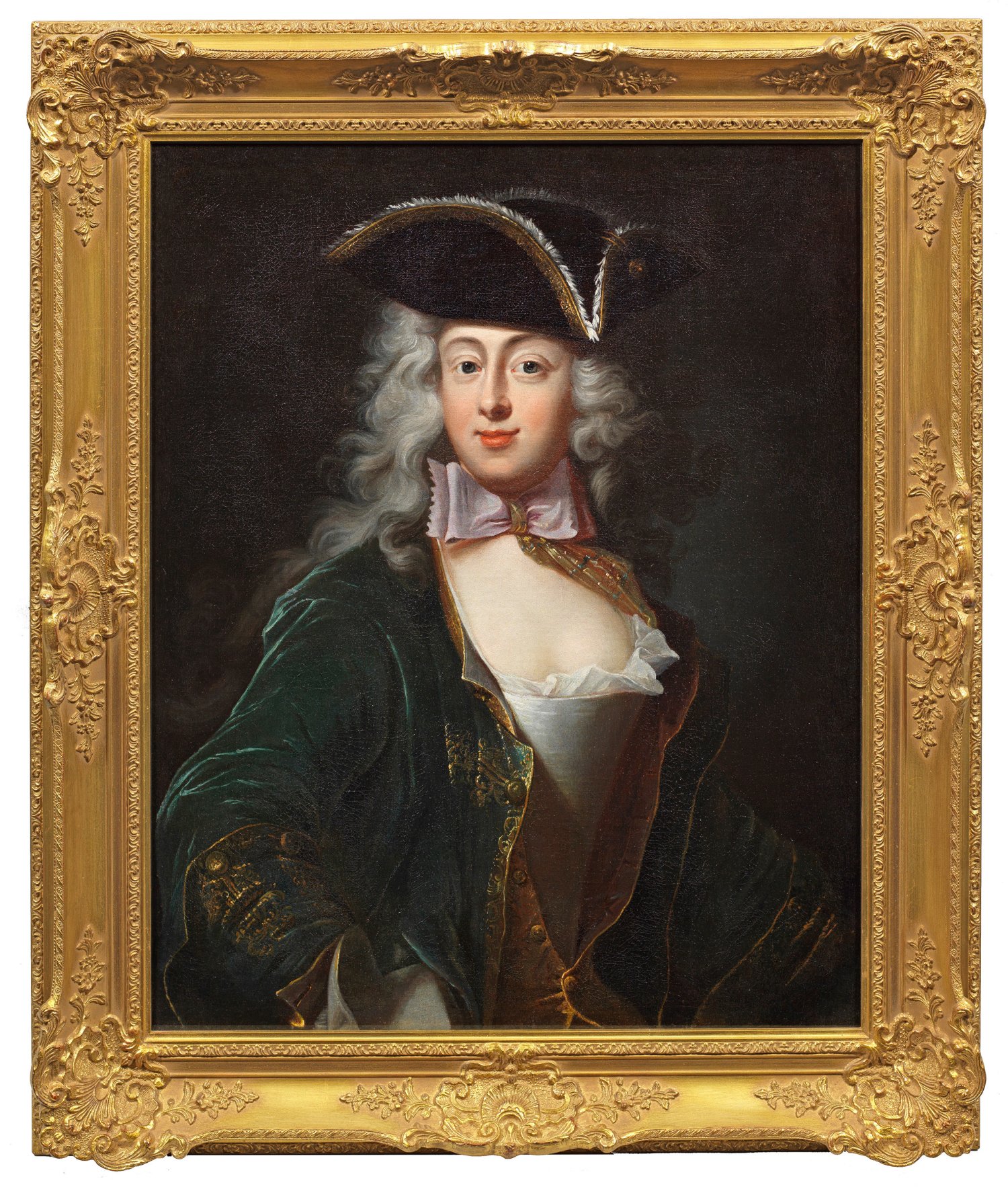 Das 1715-1722 entstandene Bildnis zeigt eine der berühmten Mätressen Augusts des Starken (1670 - 1733), als Friedrich August I. Kurfürst von Sachsen sowie seit 1697 in Personalunion als August II. König von Polen und Großfürst von Litauen. Agnieszka Emercjanna (ca. 1690 - nach 1759), war seit 1709 Ehefrau des Großschatzmeisters und Großhetmans von Litauen, Ludwik Konstanty Pociej. Seit 1715 verbrachte sie immer mehr Zeit am königlichen Hof in Warschau und Dresden, wo sie Mätresse August II. wurde. 1719 gebar sie eine Tochter, wahrscheinlich ein Kind des Königs. Anfang 1730 verwitwet, heiratete Agnieszka Emercjanna noch im selben Jahr Graf Joseph Alexandre de Montmorency de Bours (gest. 1759), Feldmarschall der sächsischen Armee. Der Künstler hat den selbstbewussten und zugleich erotisch-koketten Charakter ihrer Persönlichkeit eindringlich wiedergegeben, indem er eine dynamische Pose mit einem maskulinen Outfit verband: sie trägt einen Dreispitz, das Justaucorps ist so weit geöffnet, dass ihr Dekolleté sichtbar wird, am Hals hat sie neckisch eine zartviolette Schleife gebunden. Durch das in zarten Chamois- und Rosatönen ausgeführte Inkarnat werden ihr Körper und Gesicht mit vollen, roten Lippen gleichsam plastisch modelliert. Die Bilderfindung dieses Damenporträts in Herrenkleidung gehört zu den einprägsamsten, die Manyoki je gelangen. Zugleich vermittelt es einen treffenden Eindruck der erotisch aufgeladenen Atmosphäre an den beiden Höfen Augusts des Starken. Eine zweite, nur in Details abweichende Version befindet sich im Lazienki-Palast in Warschau. Jenes Gemälde gehört zu einer Gruppe von Porträts, die König Stanislaus II. August Poniatowski von Polen wahrscheinlich 1764 zusammen mit dem Gut Ujazdów von Kasper Lubomirski erwarb; im Inventarverzeichnis der Galerie von Stanislaw August wurde das Gemälde 1784/92 als Werk Manyokis aufgeführt. Der geachtete Porträtist Adam Manyoki wurde 1713 als Hofmaler Augusts des Starken nach Dresden berufen, wo er zunächst bis 1723 wirkte. Dort und auf Reisen entstanden zahlreiche Porträts bekannter und bedeutender Personen des Hochadels und der Hofgesellschaften. Seit 1738 war er neben dem Hofmaler Louis de Silvestre erneut am Hof in Dresden tätig, schuf Porträts von Friedrich August II., Sohn Augusts des Starken, und der Aristokratie. Öl/Lwd., doubl.; 71 cm x 57 cm. Rahmen.