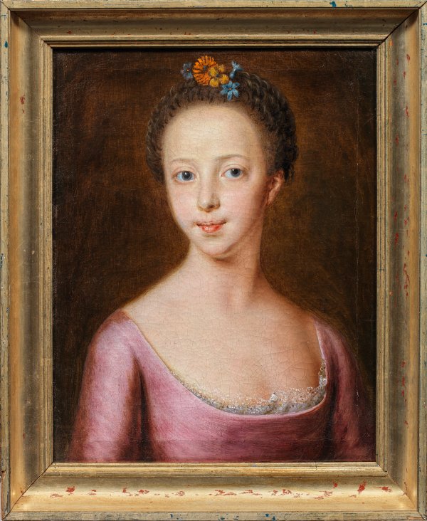 Stiltypisches Porträt Möllers, Caroline Henriette Kircheisen (geb. 1747) als Mädchen darstellend. Sie war die Tochter von Karl David Kircheisen (gest. 1770), Geheimer Kriegsrat, Polizeipräsident und Präsident des Magistrats in Berlin. Ab 1712 ist Möller in Deutschland nachweislich als Maler tätig, zuerst in Greifswald, Berlin und bis 1720 in Kassel. 1723 schuf er für Schloss Frederiksberg (königl. Sommerresidenz) eine Reihe von Damenbildnissen, genannt "die italienischen Schönheiten". 1724 und 1737 residierte er in Wien, wo er u.a. Karl VI. und Maria Theresia porträtierte. Ab 1740/41 lehrte er am Dänischen Hof König Frederik IV. das Zeichnen und kehrte 1752 endgültig nach Berlin zurück. Öl/Lwd.; Rückseitig vom Künstler bez., betitelt, Ortsangabe Berlin u. dat. 1757. 44 cm x 35 cm. Rahmen.